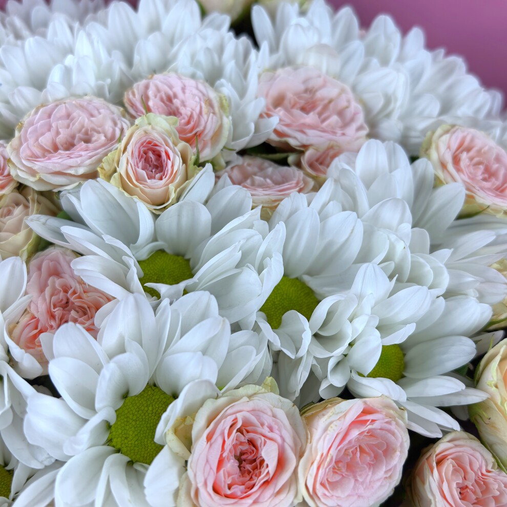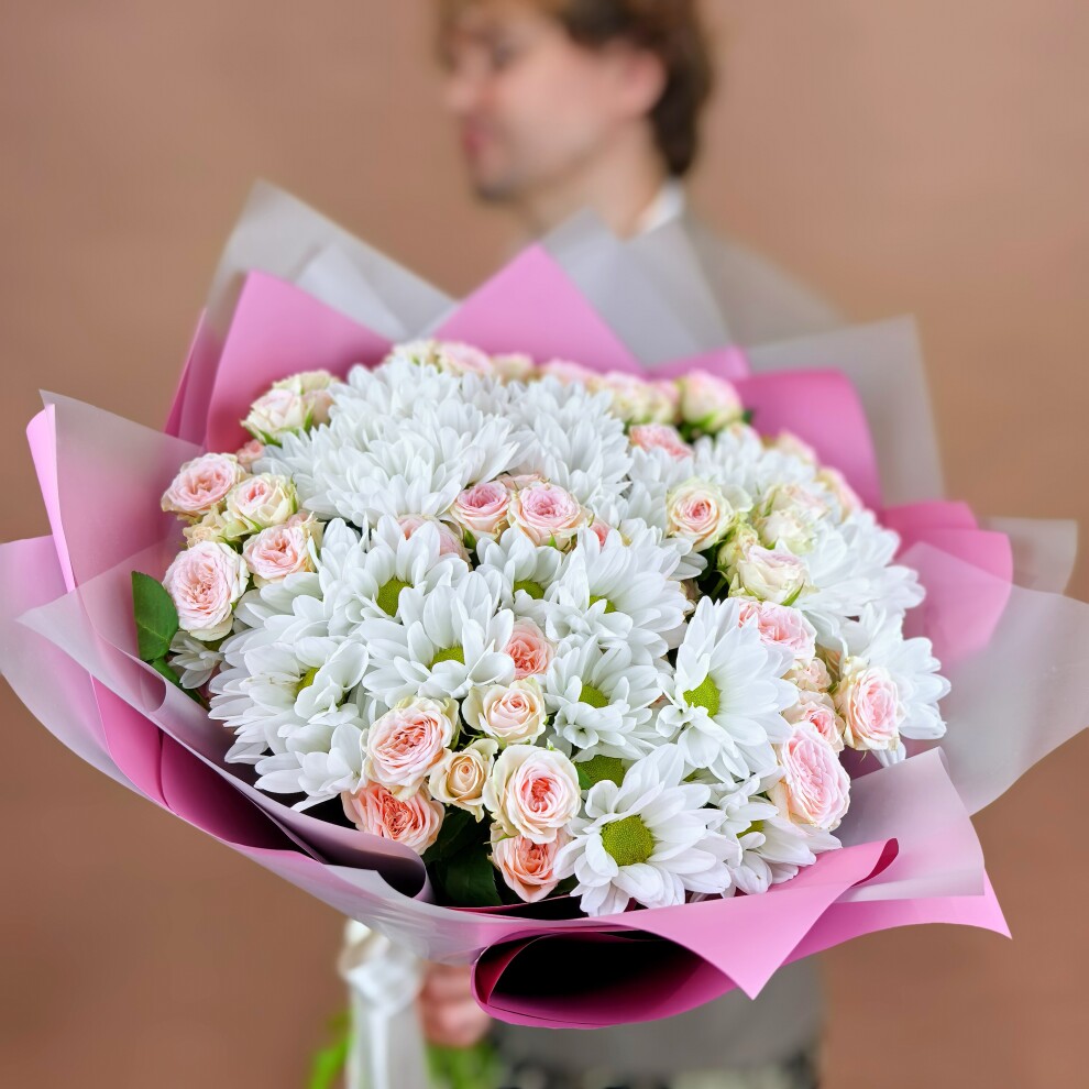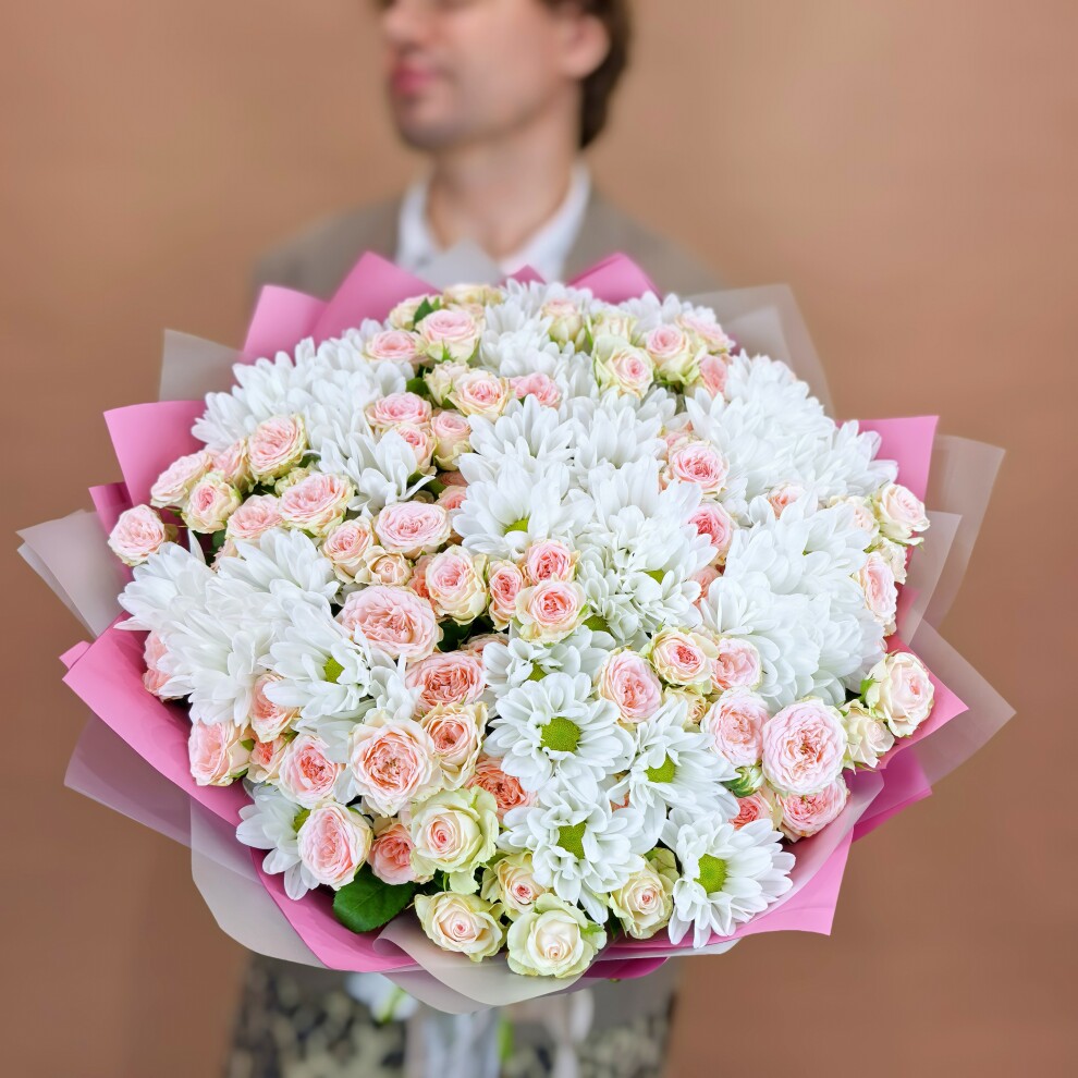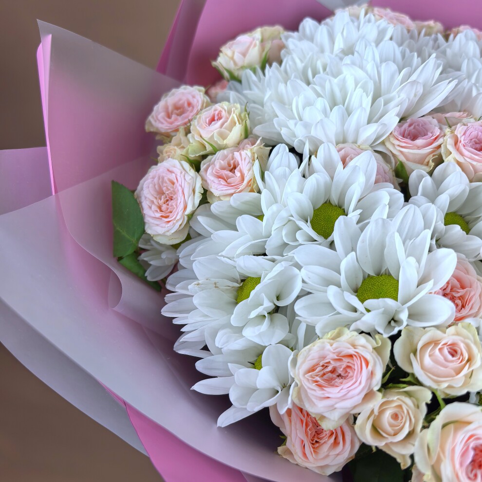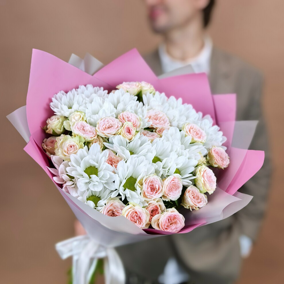Этот букет выглядит очень элегантно и нежно. Он состоит из белых кустовых хризантем и розовых кустовых роз, которые создают гармоничное сочетание цветов и текстур. Белые хризантемы придают букету свежесть и воздушность, а розовые розы добавляют романтичности и тепла.