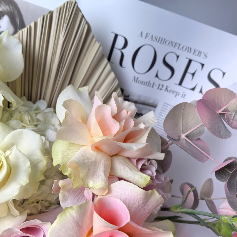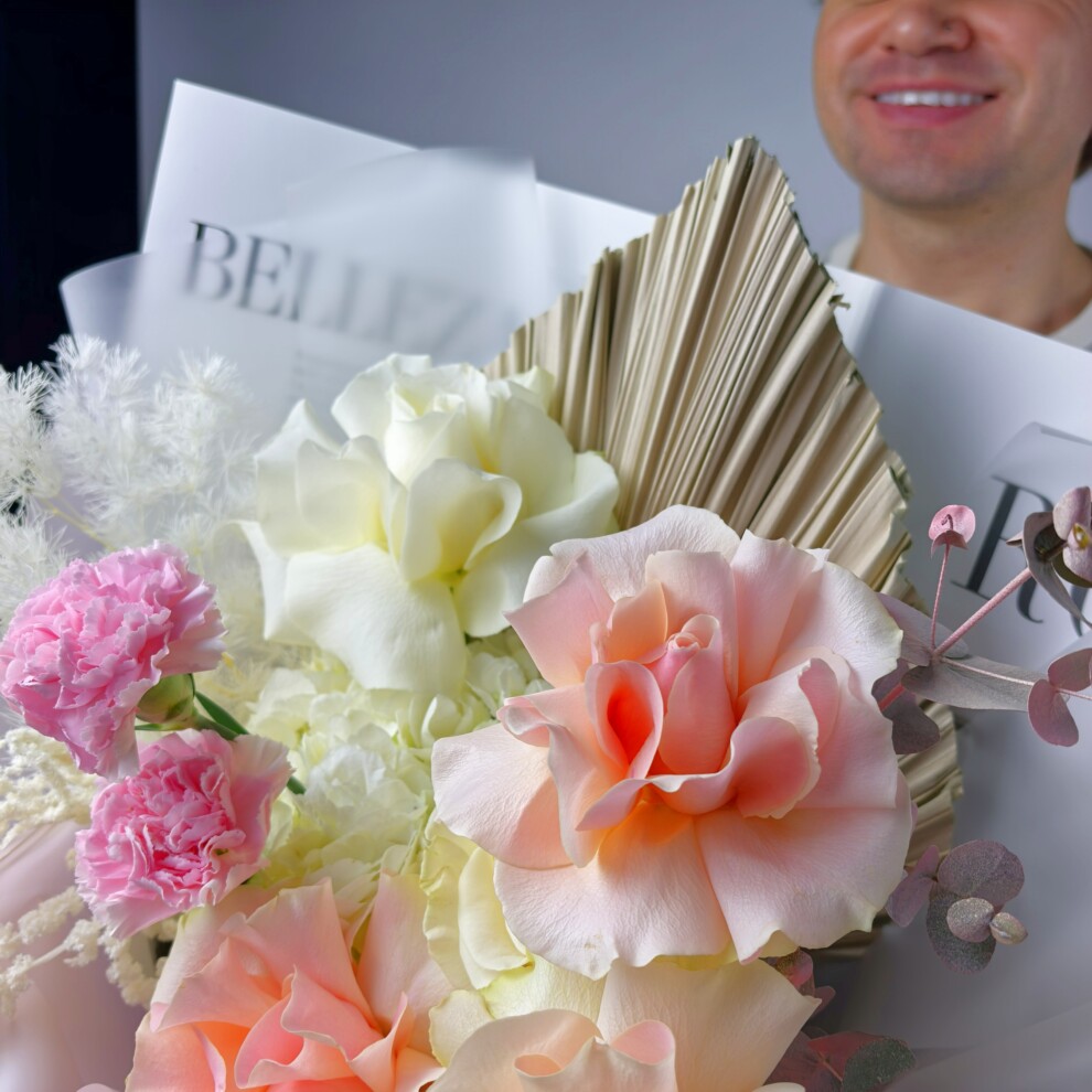 Перед вами — воплощение цветочной элегантности и утончённости. Этот букет словно сошёл со страниц модного журнала, сочетая в себе изысканность, гармонию оттенков и продуманную композицию.