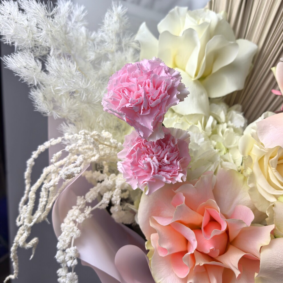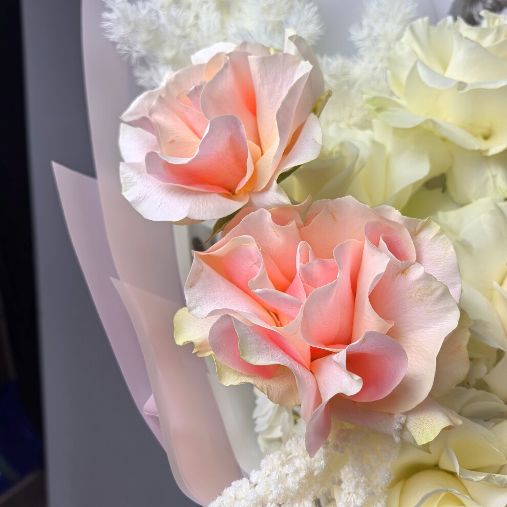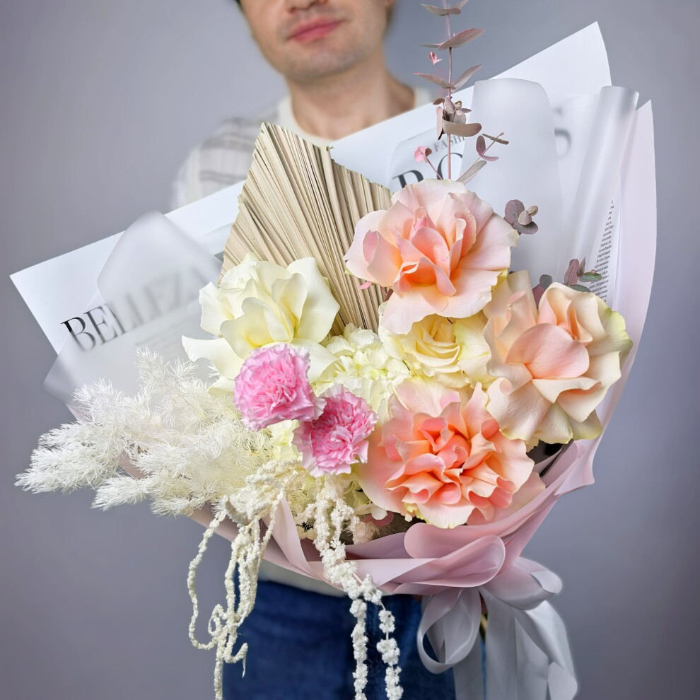 Центром композиции стали роскошные французские розы в нежных пастельных оттенках: от кремово-жёлтого до персикового и нежно-розового. Их пышные, слегка волнистые лепестки создают ощущение воздушности и романтичности, а плавные переходы цвета придают букету глубину и объём.