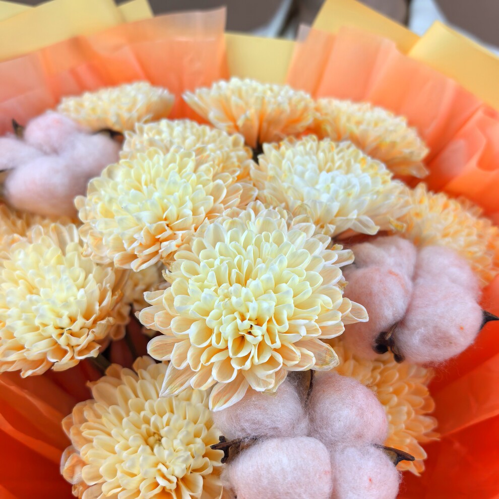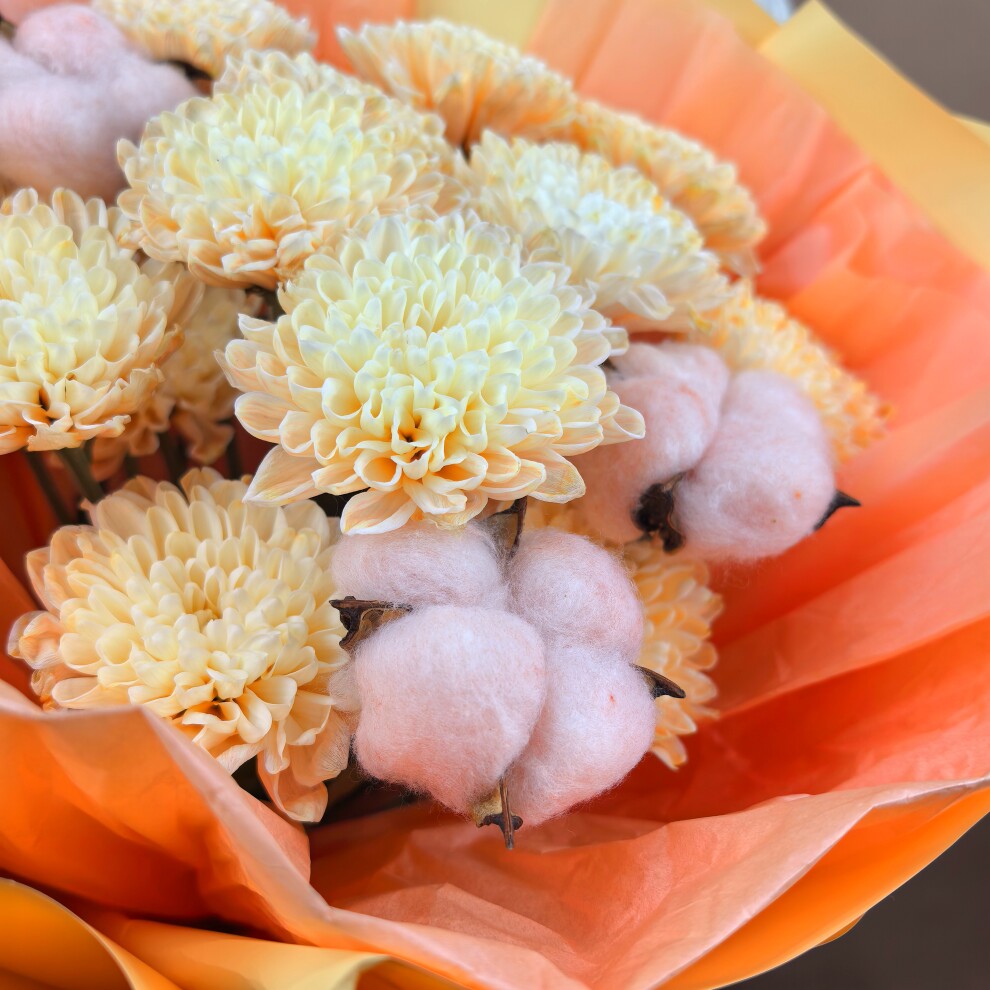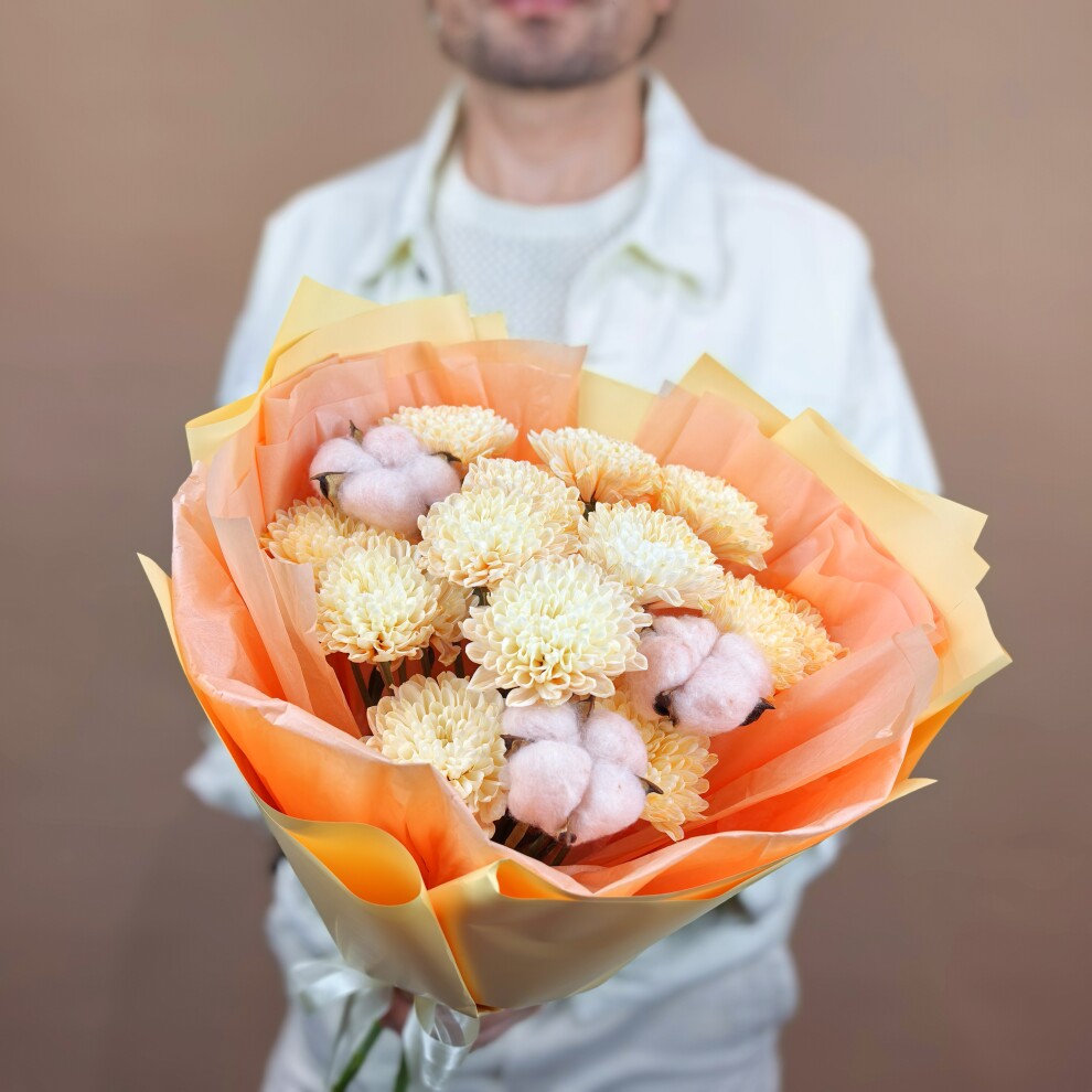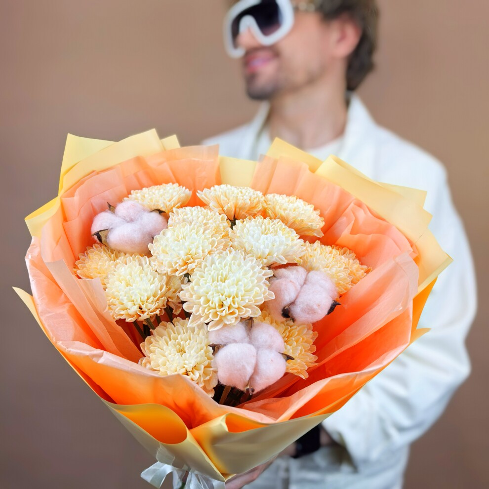 В его композиции гармонично сочетаются крупные оранжевые хризантемы, которые символизируют чистоту и искренность, и розовые коробочки хлопка, добавляющие букету необычную текстуру и объём.
