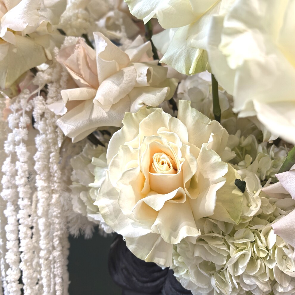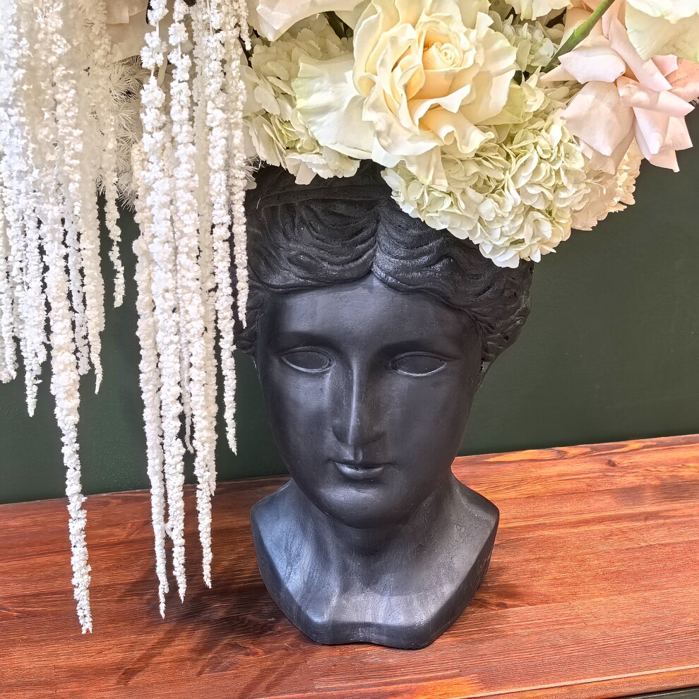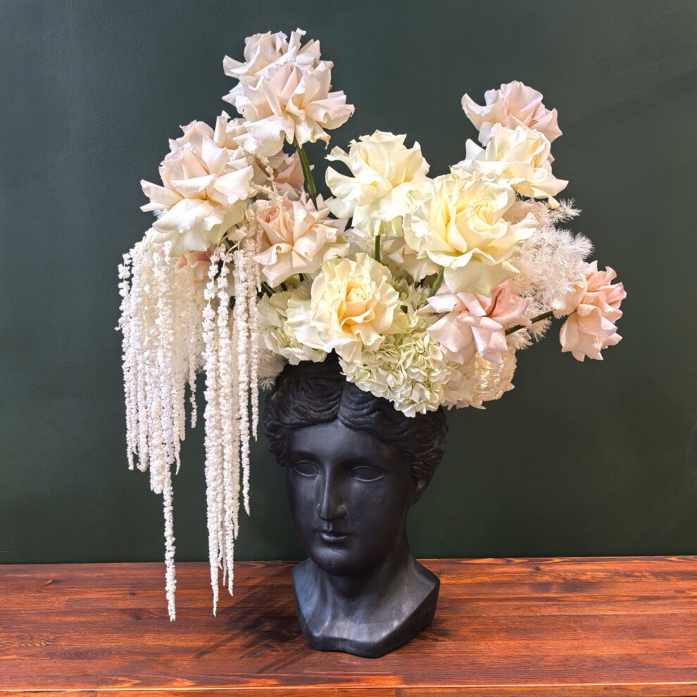 Интерьерная композиция представляет собой изысканное сочетание классики и утончённой флористики. Центральным элементом служит чёрная ваза в форме античного бюста, напоминающая о древнегреческом или римском искусстве. Гладкая матовая поверхность вазы создаёт выразительный контраст с нежной, воздушной цветочной композицией, размещённой в ней.