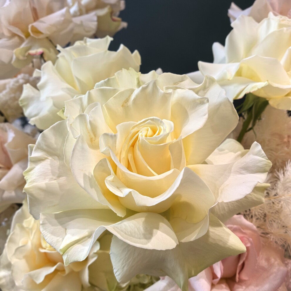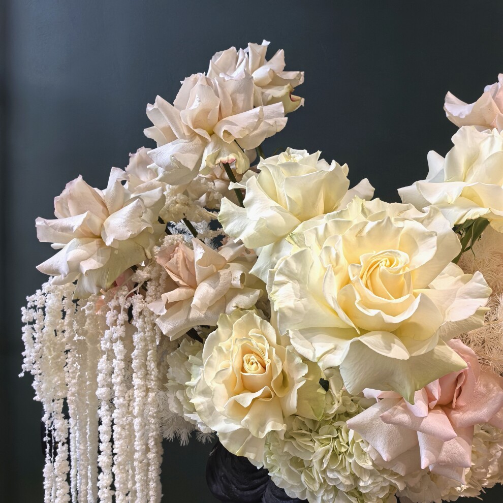 Букет состоит из множества цветов пастельных оттенков: кремовых, нежно-розовых и белых роз, которые придают композиции романтичность и лёгкость. Дополняют картину объёмные соцветия гортензии и изящные каскады белых декоративных веточек, напоминающих амарант. Эти элементы создают динамику и глубину, а также подчёркивают элегантность всей композиции.