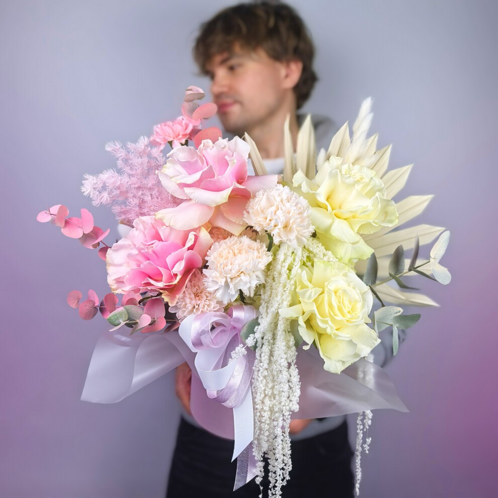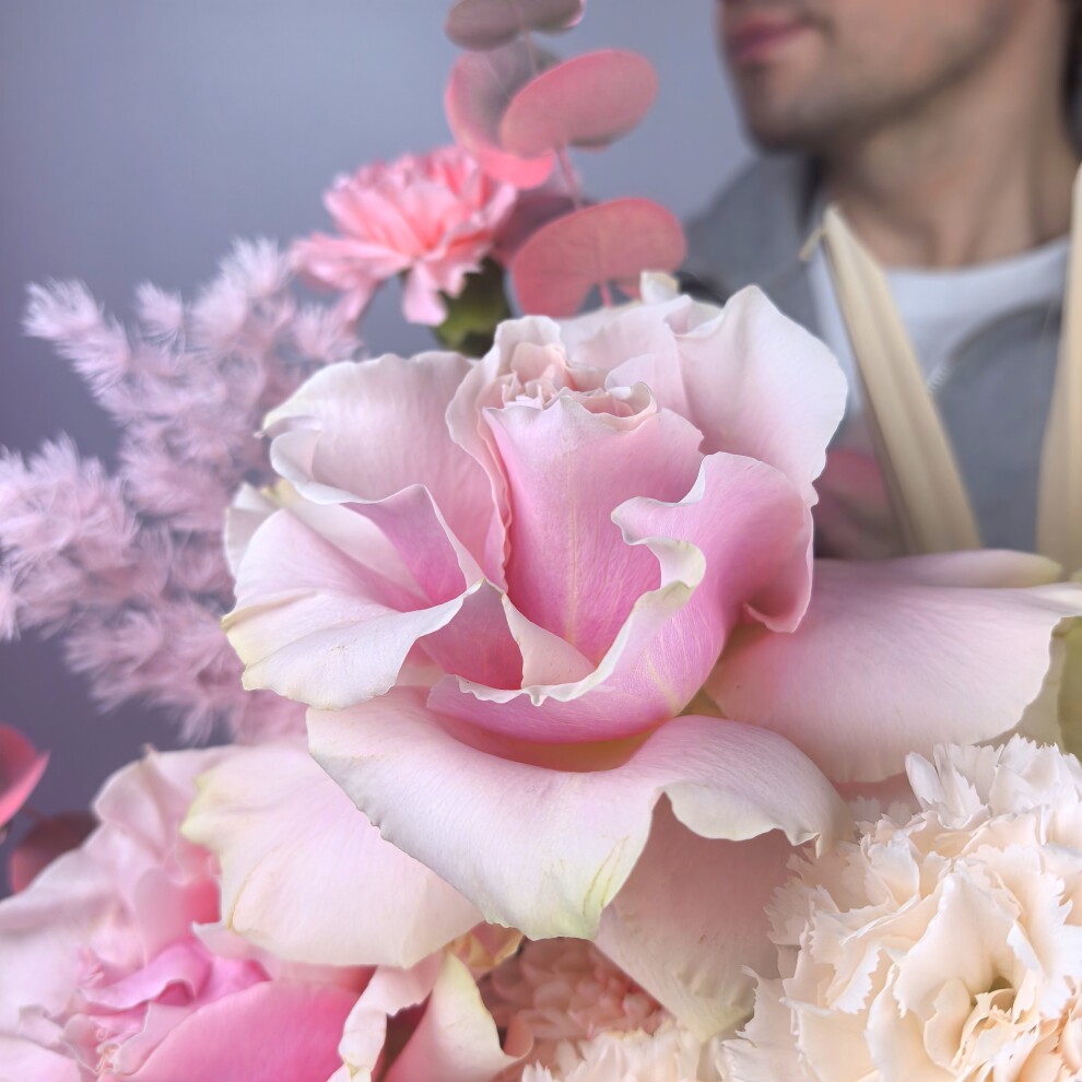 Этот букет представляет собой изысканную композицию, выполненную в нежных пастельных тонах. Основу букета составляют крупные розовые розы, которые гармонично сочетаются с белыми гортензиями. В композицию добавлены розовые гвоздики, придающие букету легкость и воздушность.