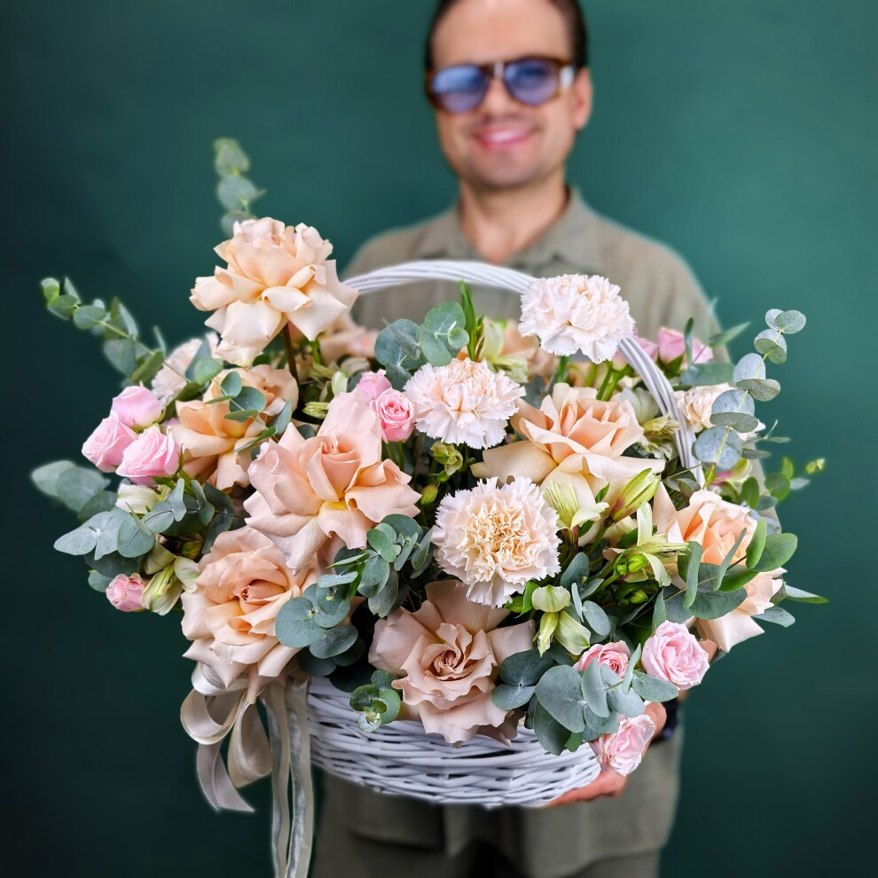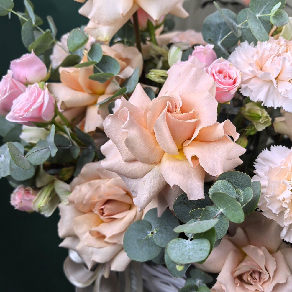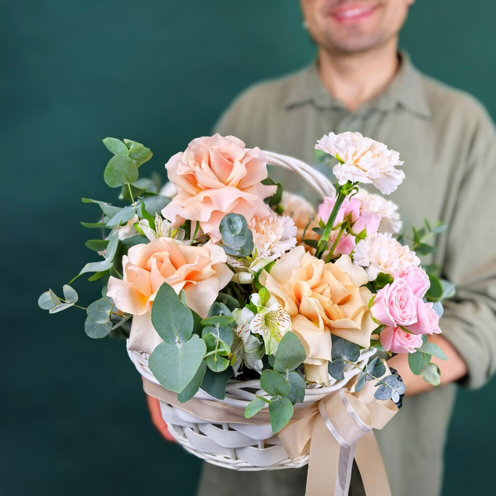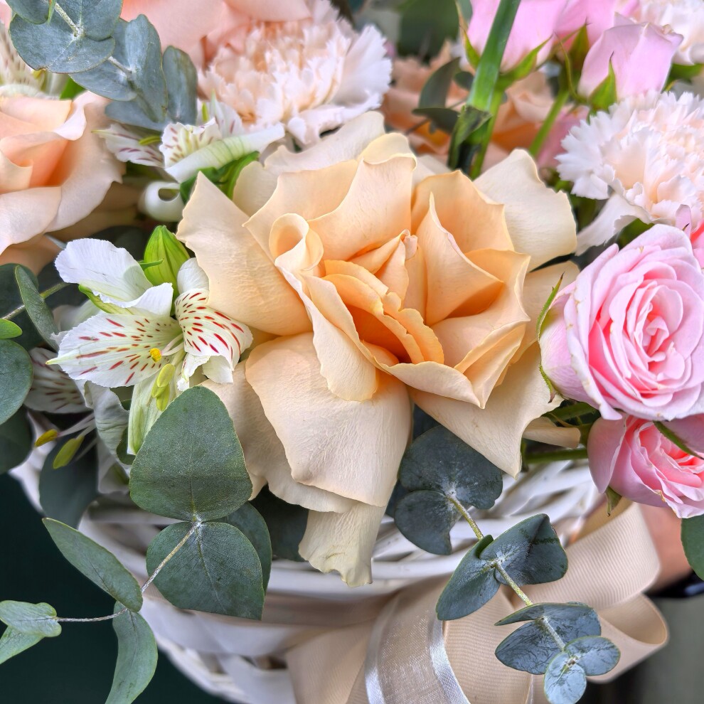 Зелёные листья эвкалипта добавляют свежести и природной гармонии, а аккуратная плетёная корзина подчёркивает элегантность букета.