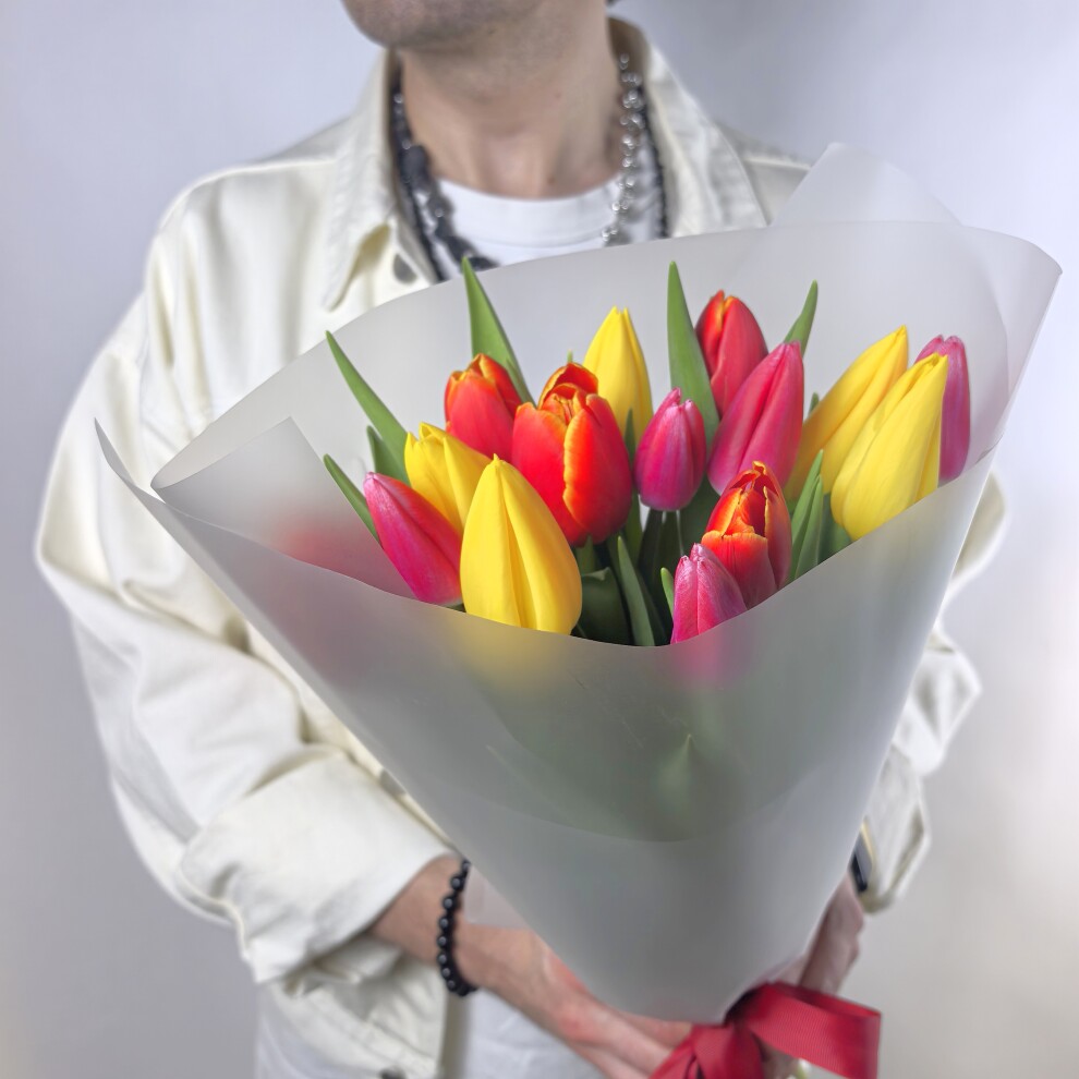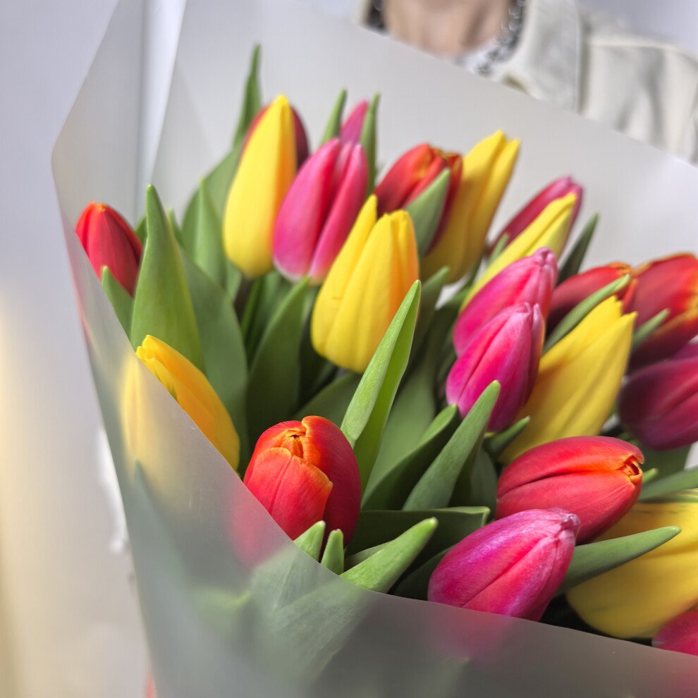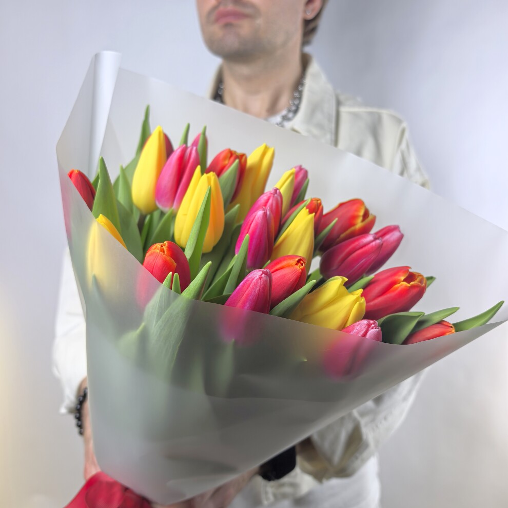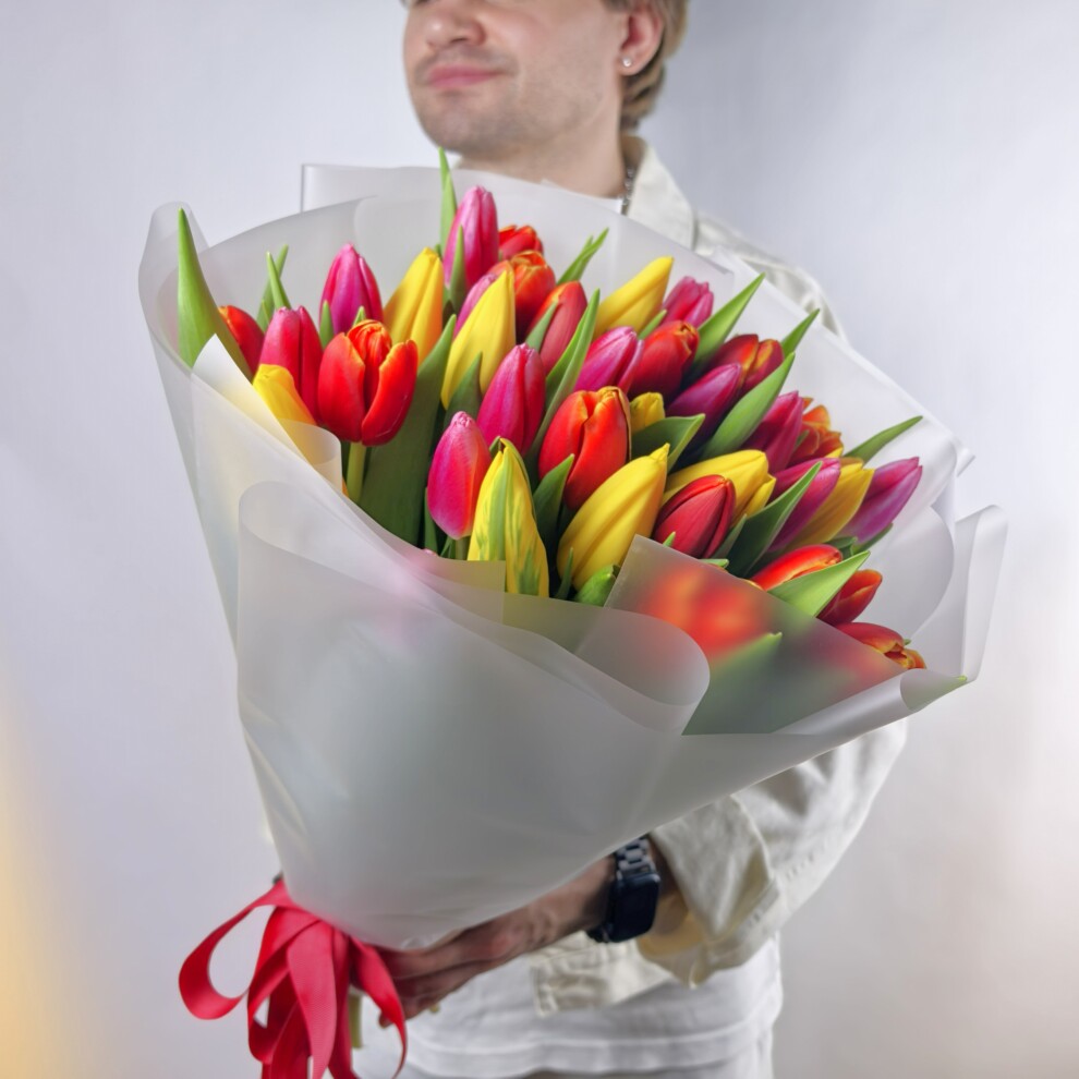 Этот роскошный букет из 35 разноцветных тюльпанов — воплощение весеннего настроения в самом ярком проявлении! Сочные бутоны, словно палитра художника, переливаются насыщенными оттенками: огненно-красные соседствуют с солнечно-жёлтыми, а нежно-розовые добавляют композиции утончённой лёгкости. Каждый цветок выглядит свежим и упругим, лепестки плотно раскрыты, излучая энергию и радость.