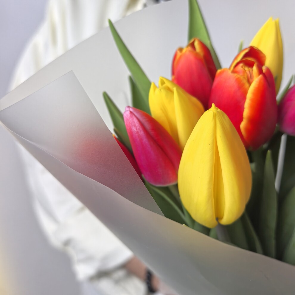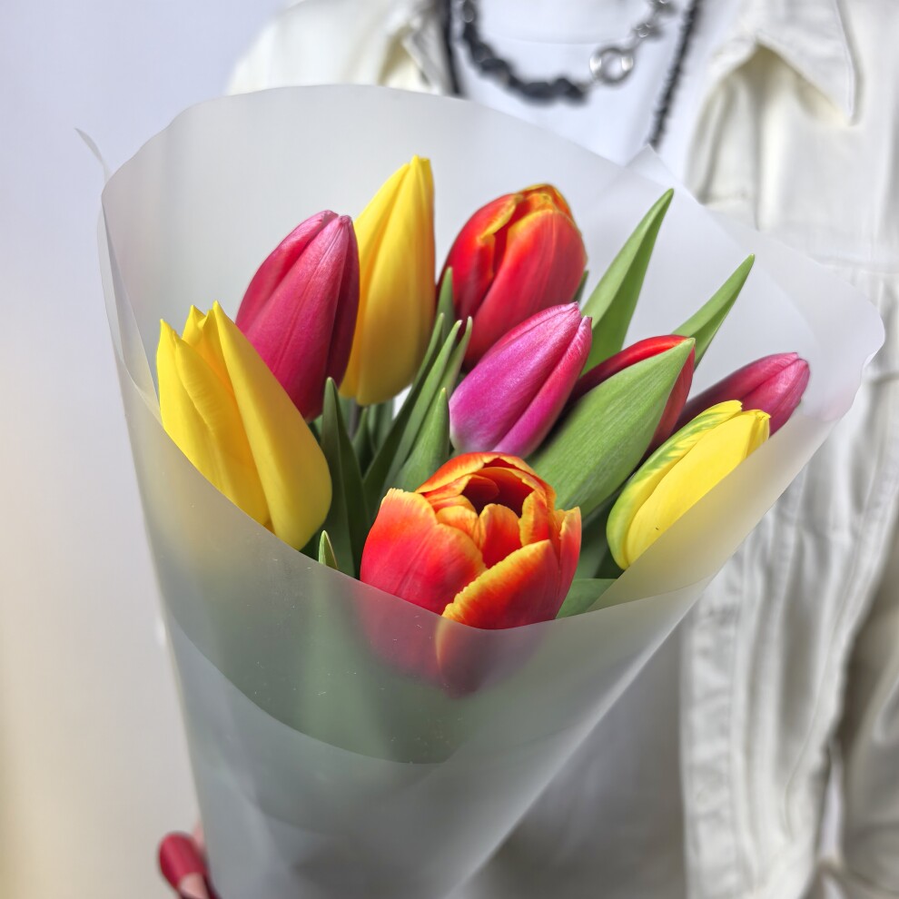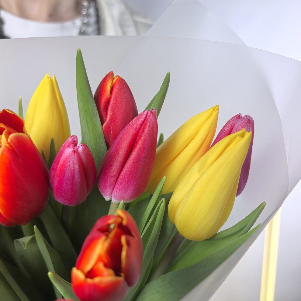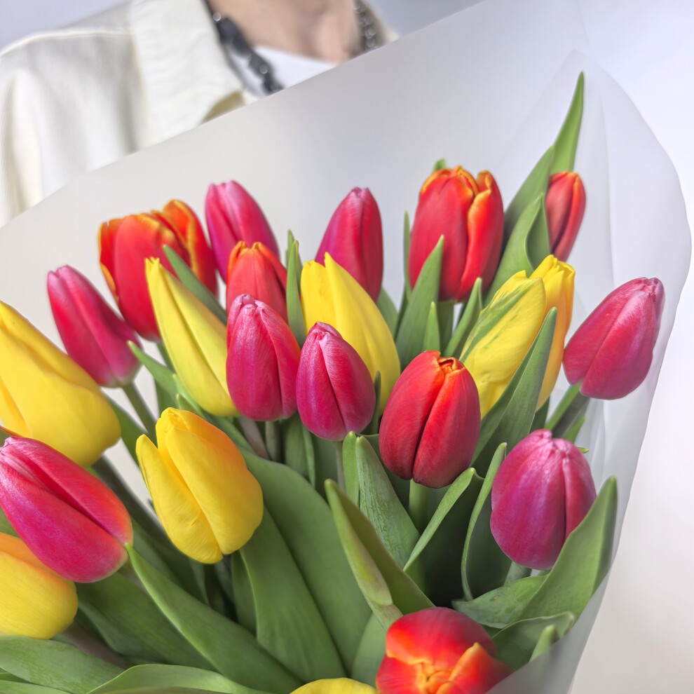 Этот роскошный букет из 35 разноцветных тюльпанов — воплощение весеннего настроения в самом ярком проявлении! Сочные бутоны, словно палитра художника, переливаются насыщенными оттенками: огненно-красные соседствуют с солнечно-жёлтыми, а нежно-розовые добавляют композиции утончённой лёгкости. Каждый цветок выглядит свежим и упругим, лепестки плотно раскрыты, излучая энергию и радость.
