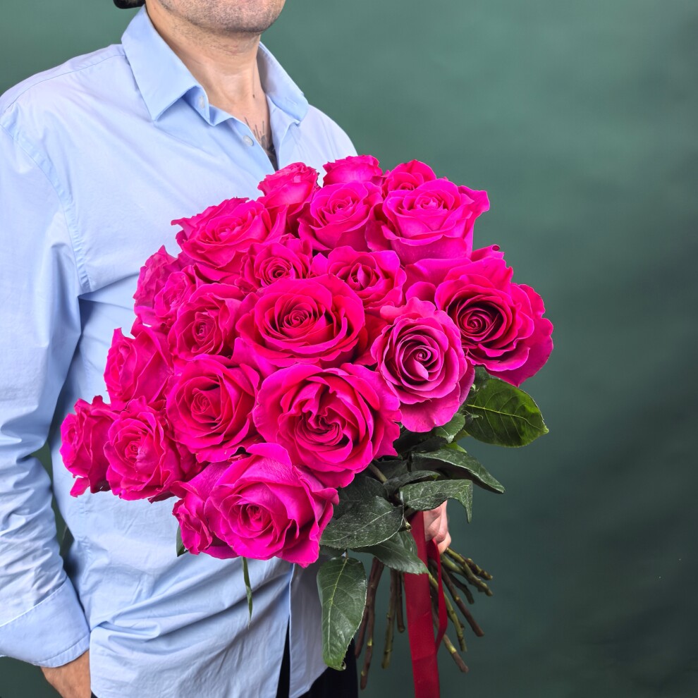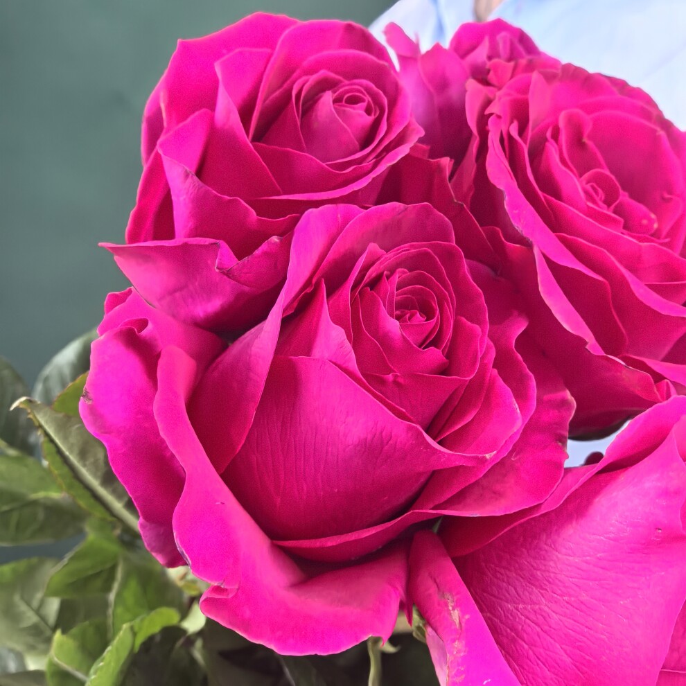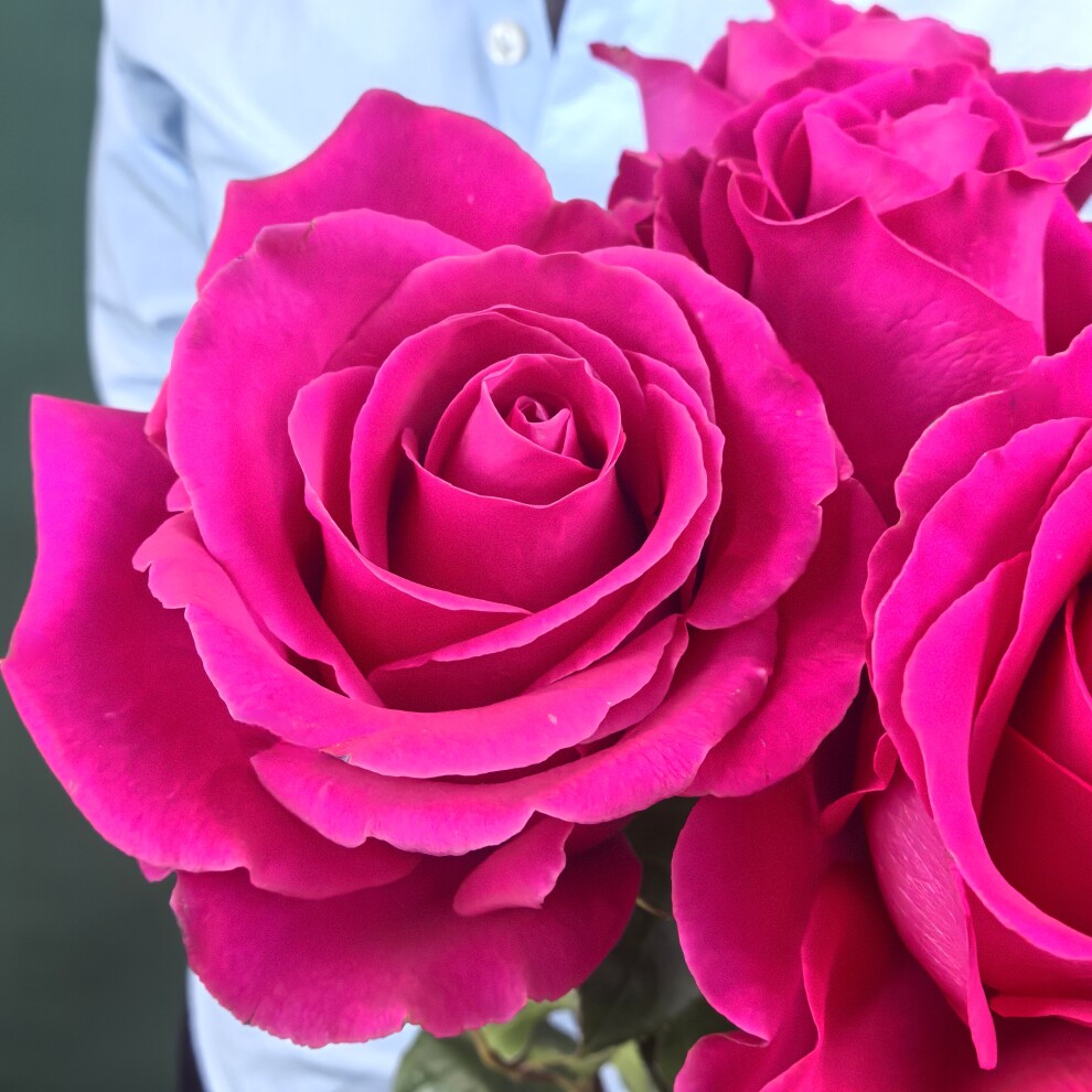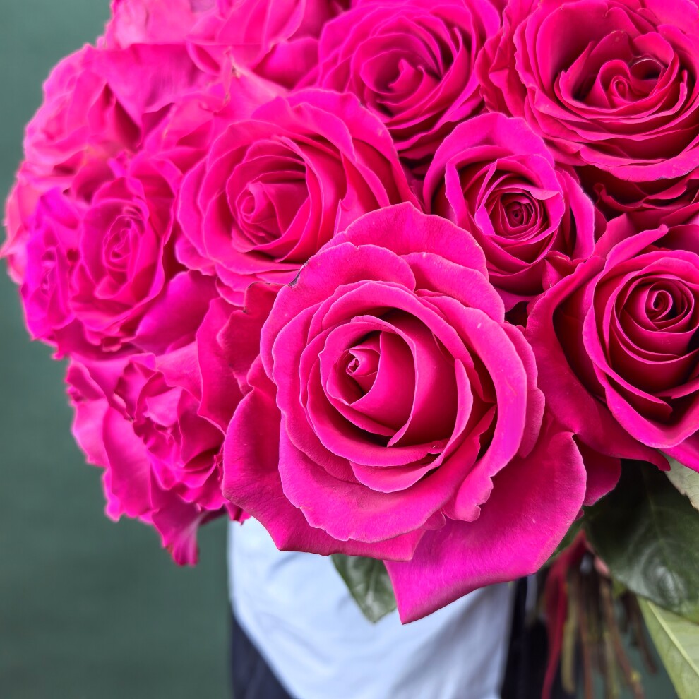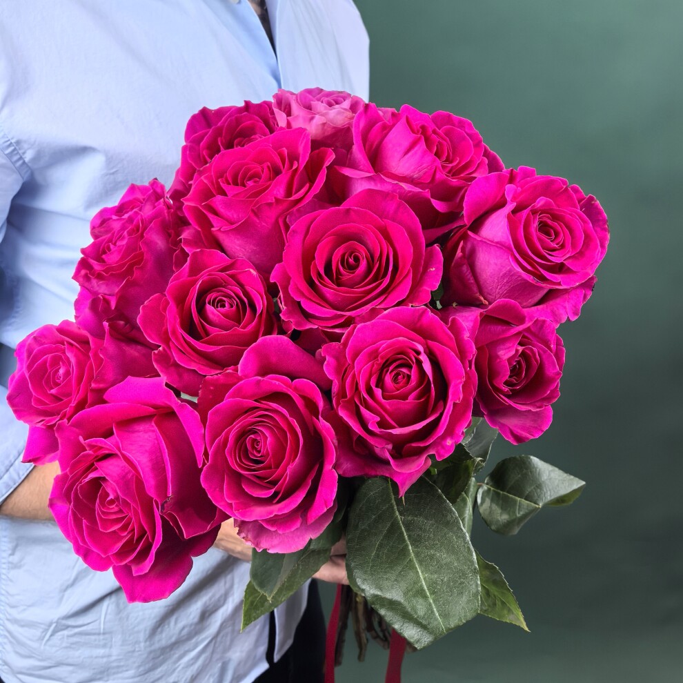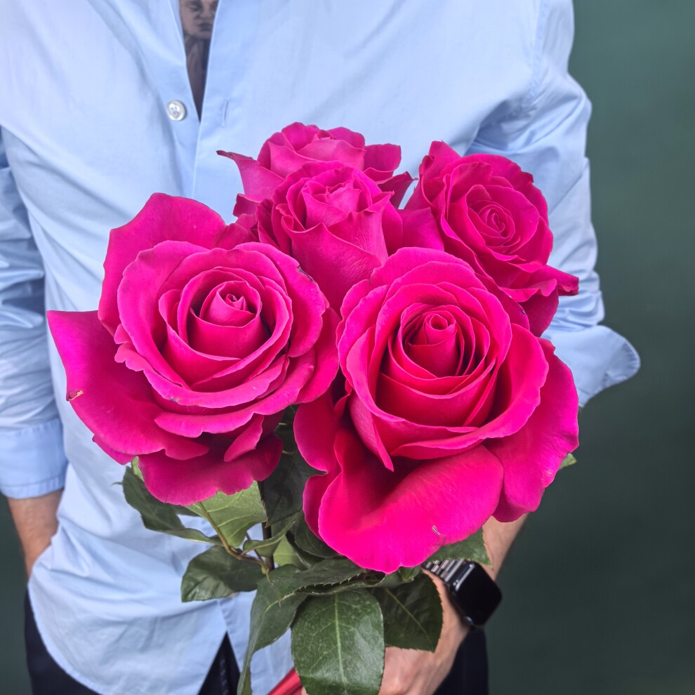 Малиновые розы сорта «Пинк Флойд» — это воплощение страсти и утонченности. Их насыщенный оттенок фуксии словно создан для того, чтобы завораживать и покорять. Каждый лепесток этих роз — как произведение искусства: бархатистый, слегка выгнутый наружу, он переливается на свету, создавая ощущение глубины и богатства цвета.