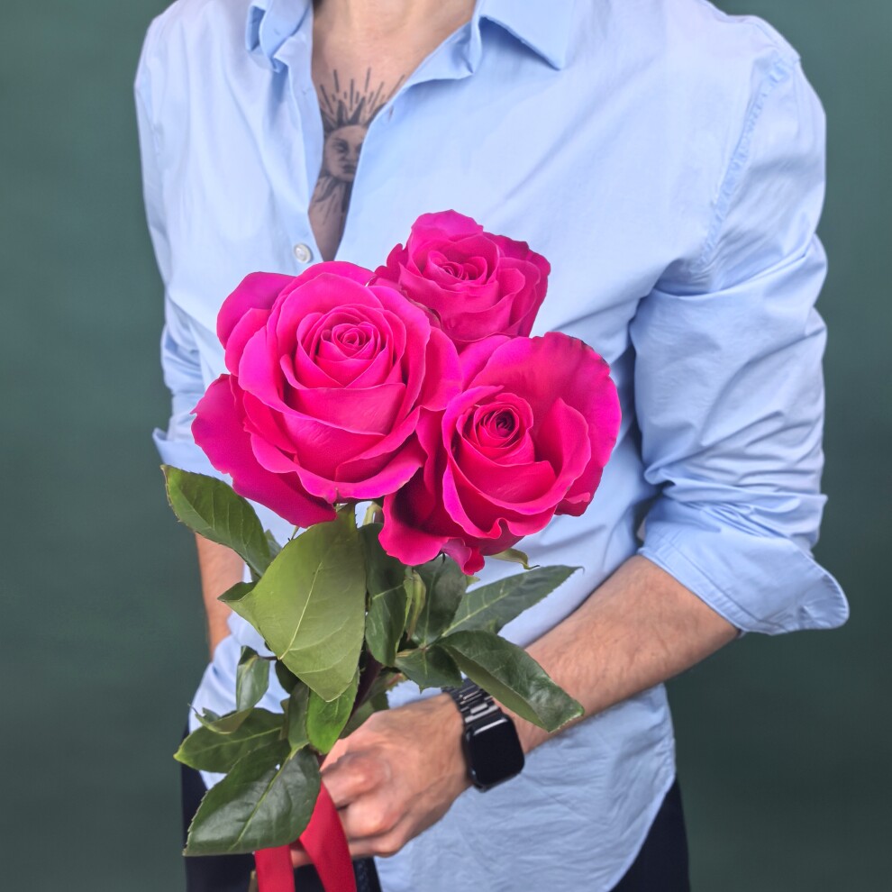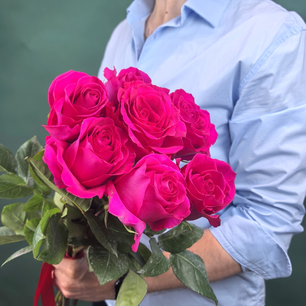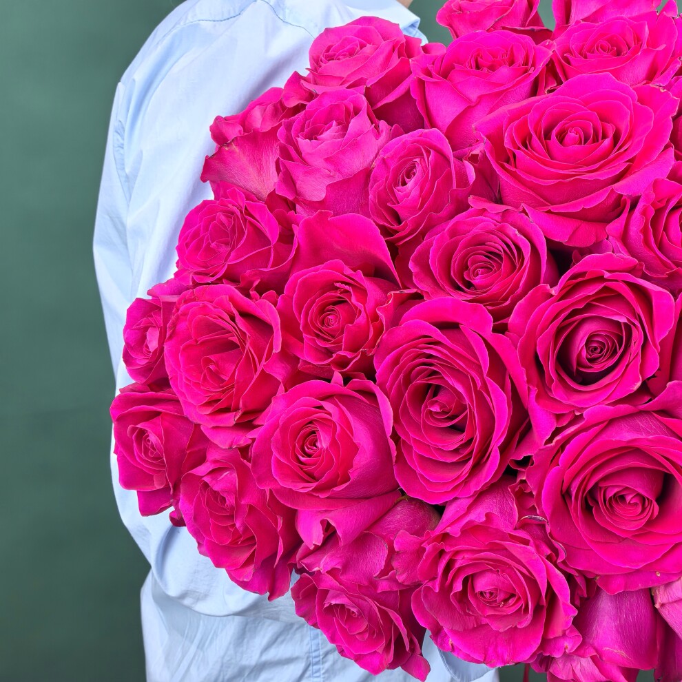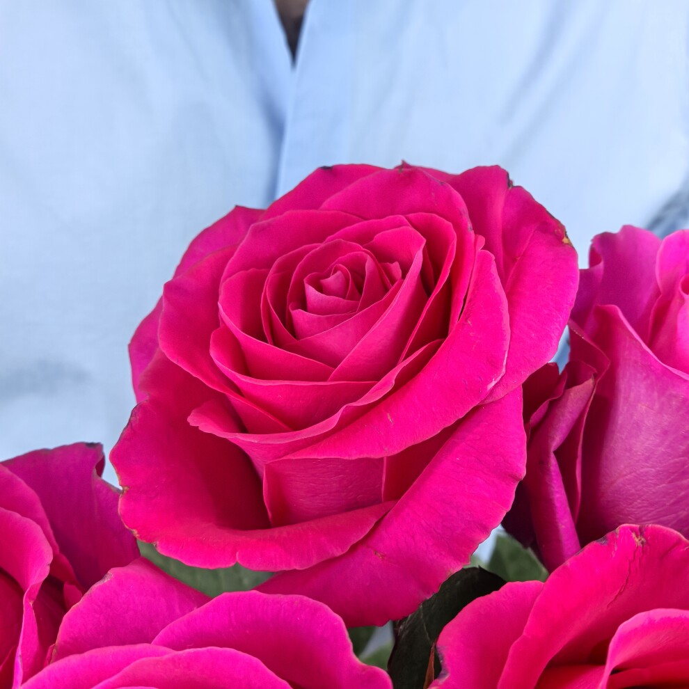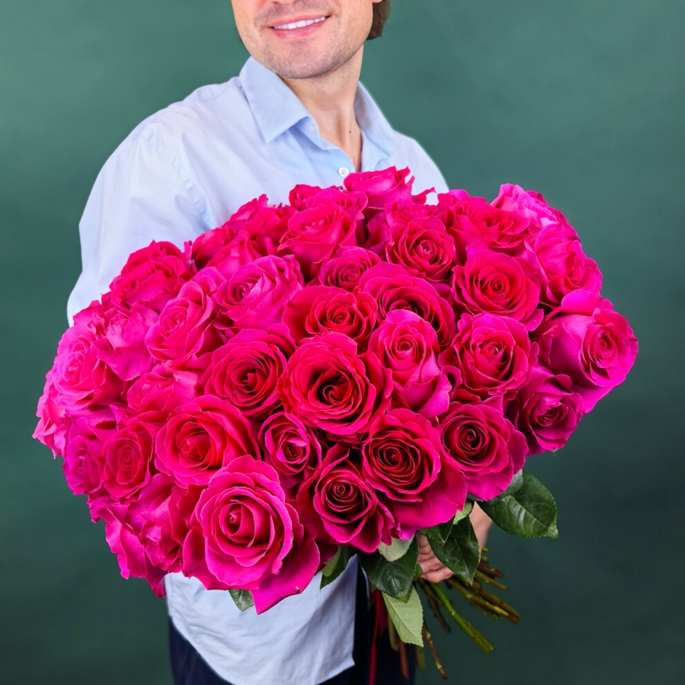Малиновые розы сорта «Пинк Флойд» — это воплощение страсти и утонченности. Их насыщенный оттенок фуксии словно создан для того, чтобы завораживать и покорять. Каждый лепесток этих роз — как произведение искусства: бархатистый, слегка выгнутый наружу, он переливается на свету, создавая ощущение глубины и богатства цвета.