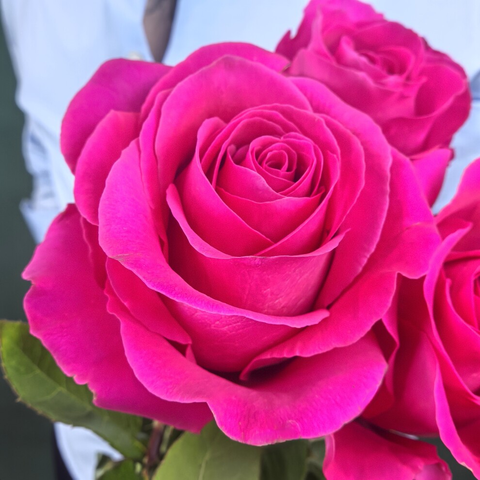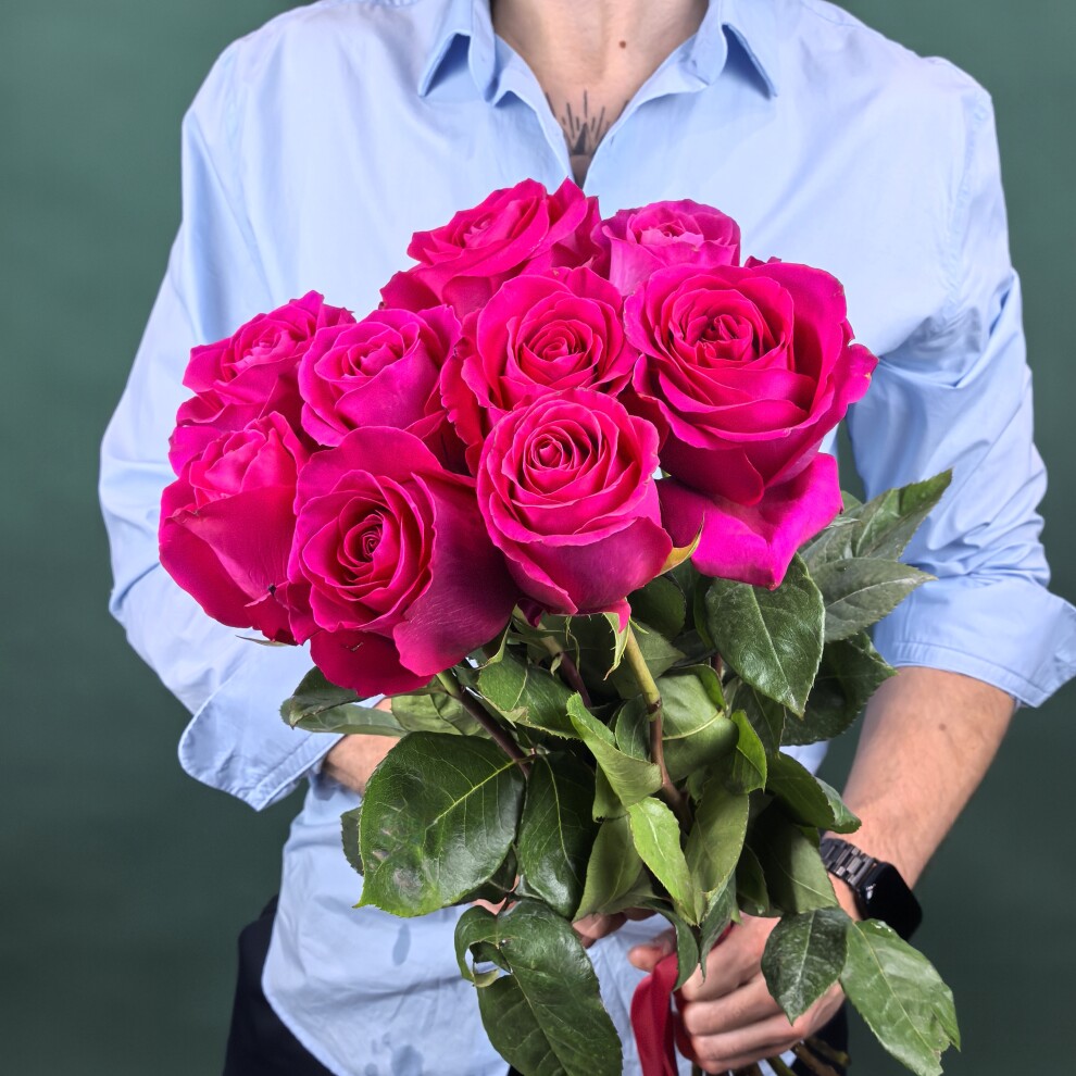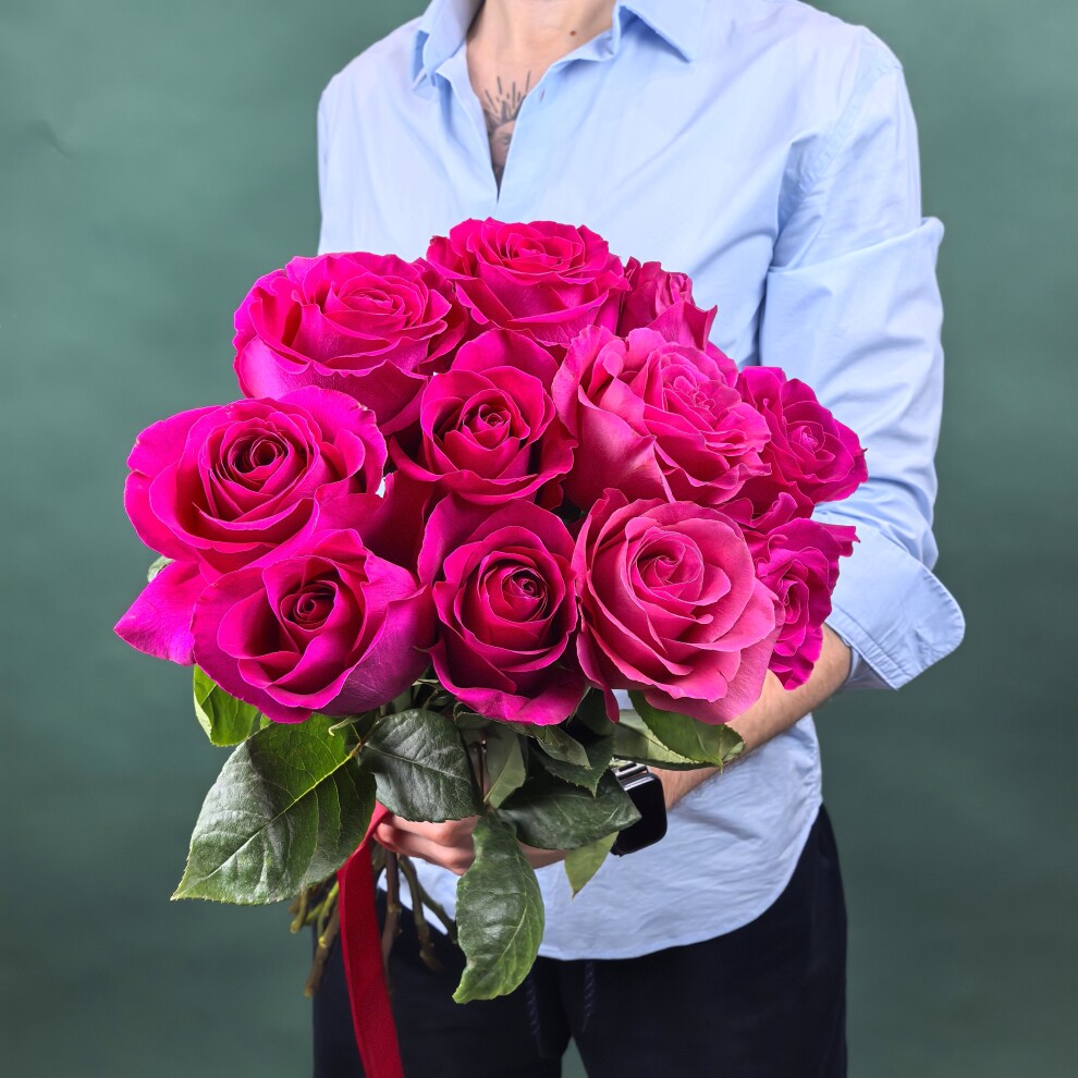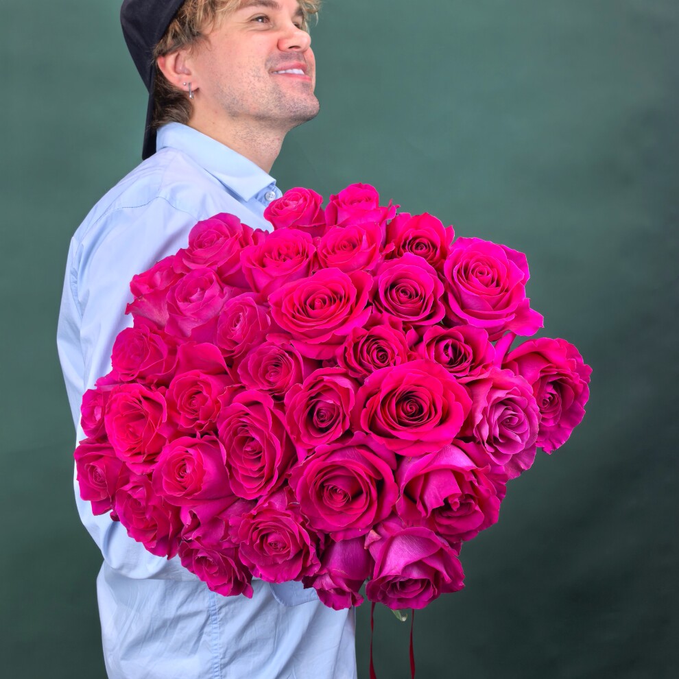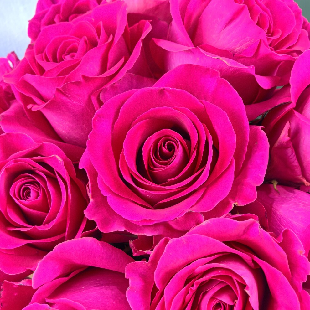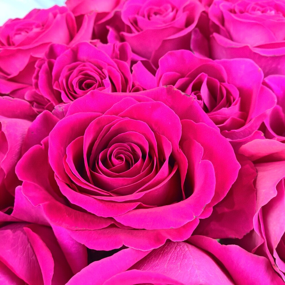 Малиновые розы сорта «Пинк Флойд» — это воплощение страсти и утонченности. Их насыщенный оттенок фуксии словно создан для того, чтобы завораживать и покорять. Каждый лепесток этих роз — как произведение искусства: бархатистый, слегка выгнутый наружу, он переливается на свету, создавая ощущение глубины и богатства цвета.