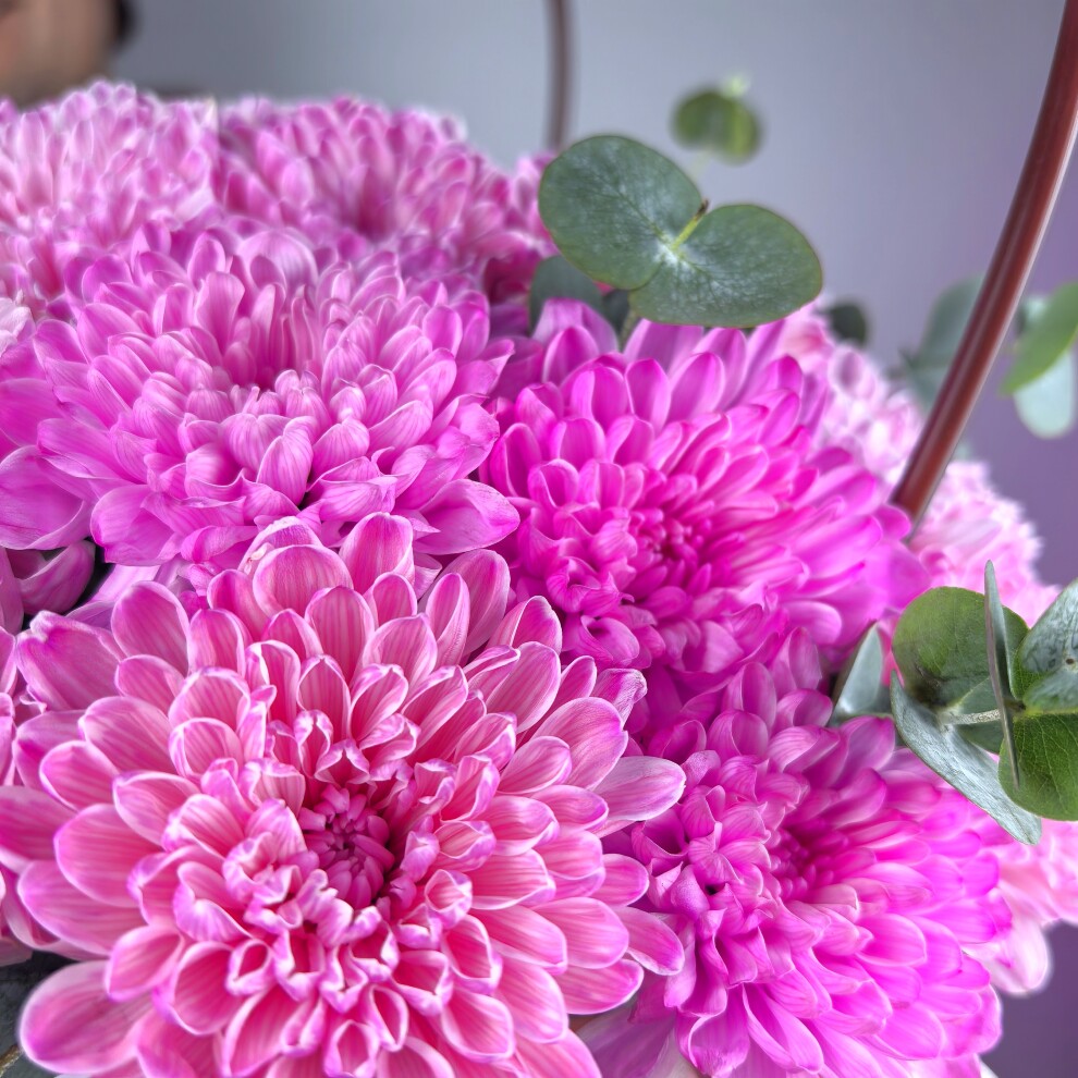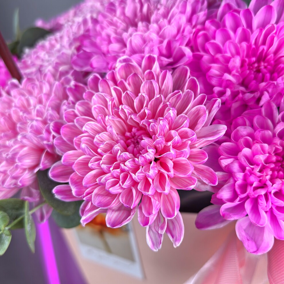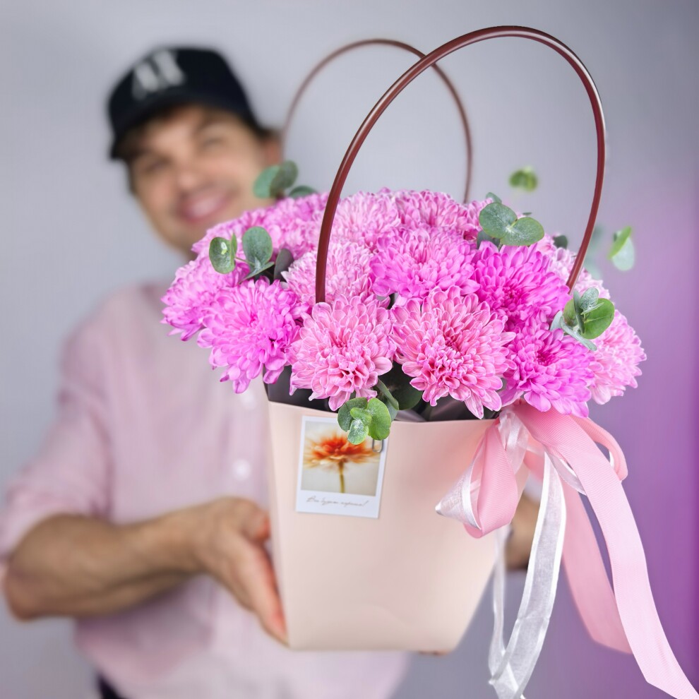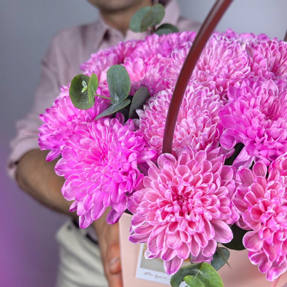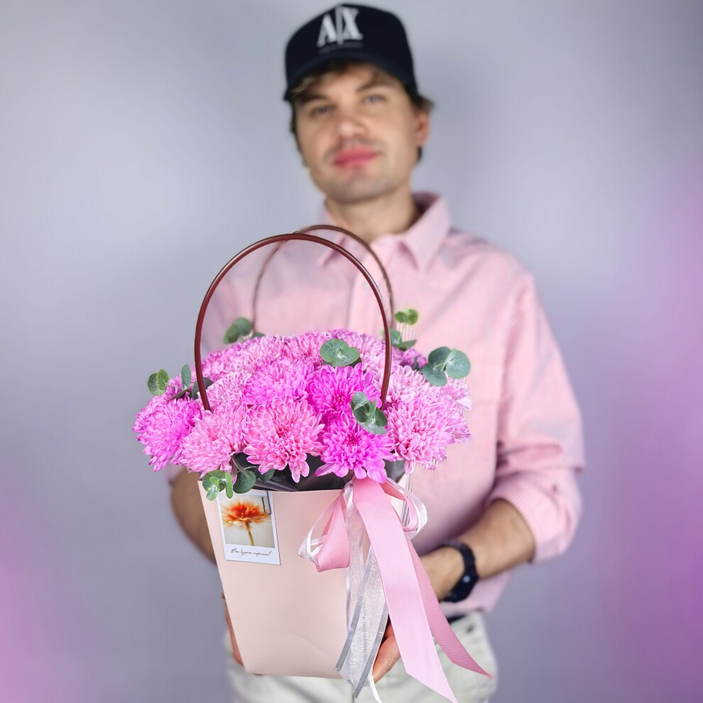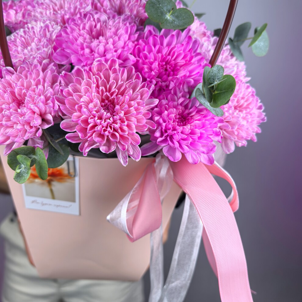 Нежные зелёные акценты добавляют свежести и гармонии, а изящная упаковка с прозрачными элементами подчёркивает естественную красоту композиции.