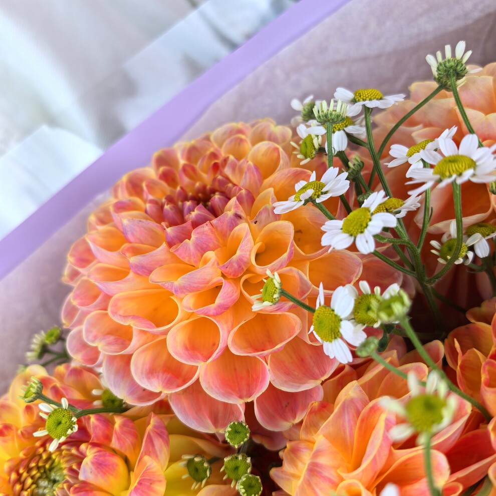 Нежные белые ромашки, словно капельки росы, добавляют композиции лёгкости и свежести, создавая гармоничный контраст с яркими георгинами. Их простота и изящество делают букет ещё более выразительным и трогательным.