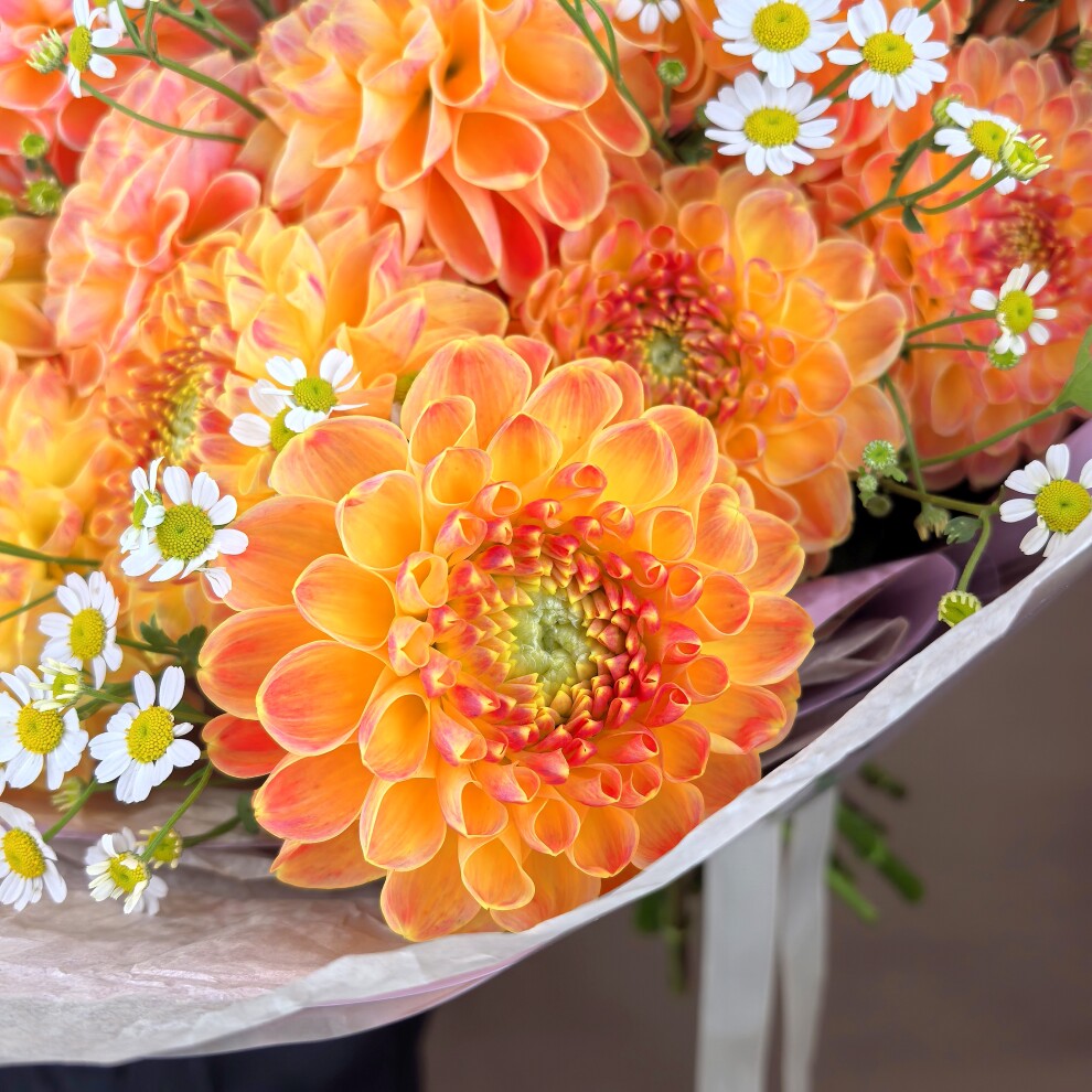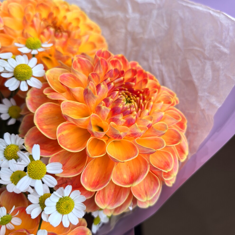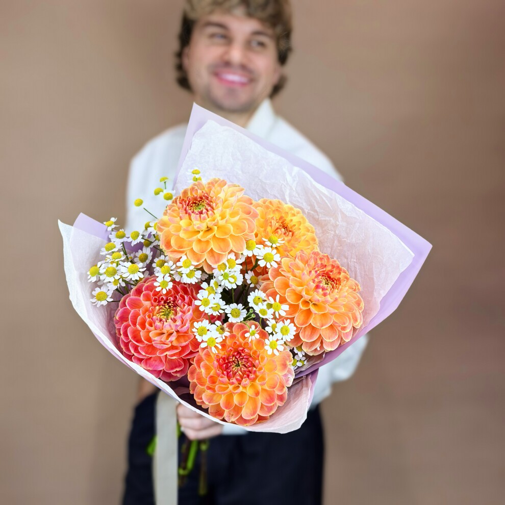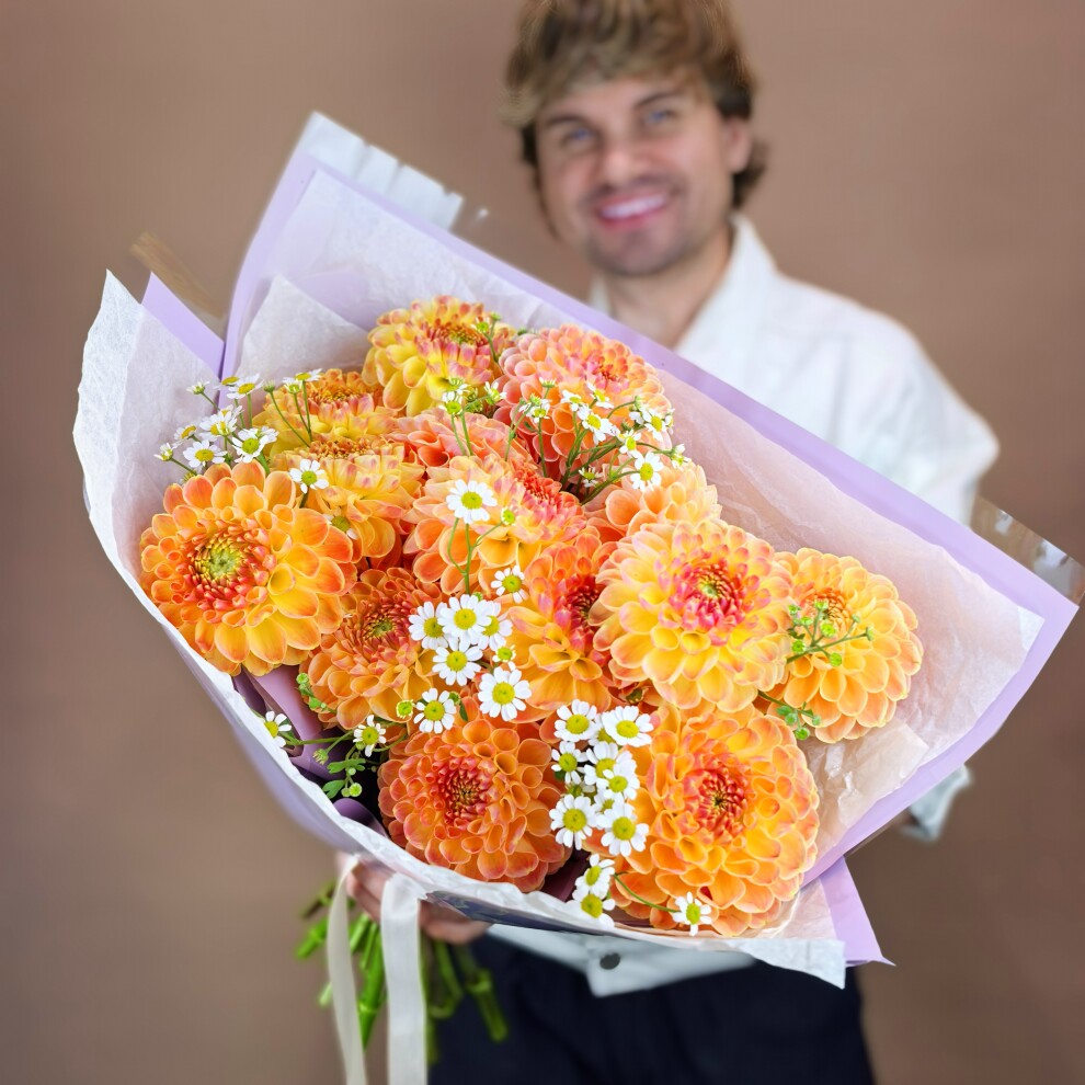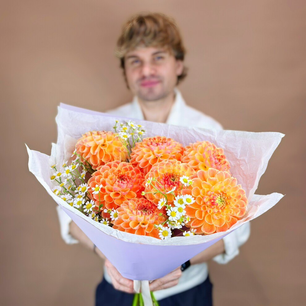 Этот букет — настоящее воплощение осеннего настроения! Яркие георгины сорта «Саммер Хейз» с их насыщенными оранжевыми лепестками и нежным канареечно-жёлтым центром словно впитали в себя тепло солнечных лучей. Они создают ощущение радости и уюта, наполняя пространство теплом и светом.