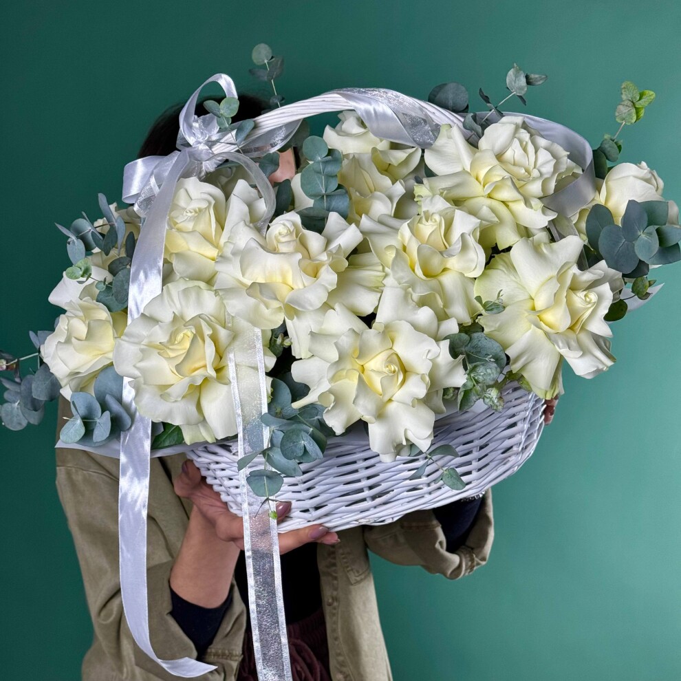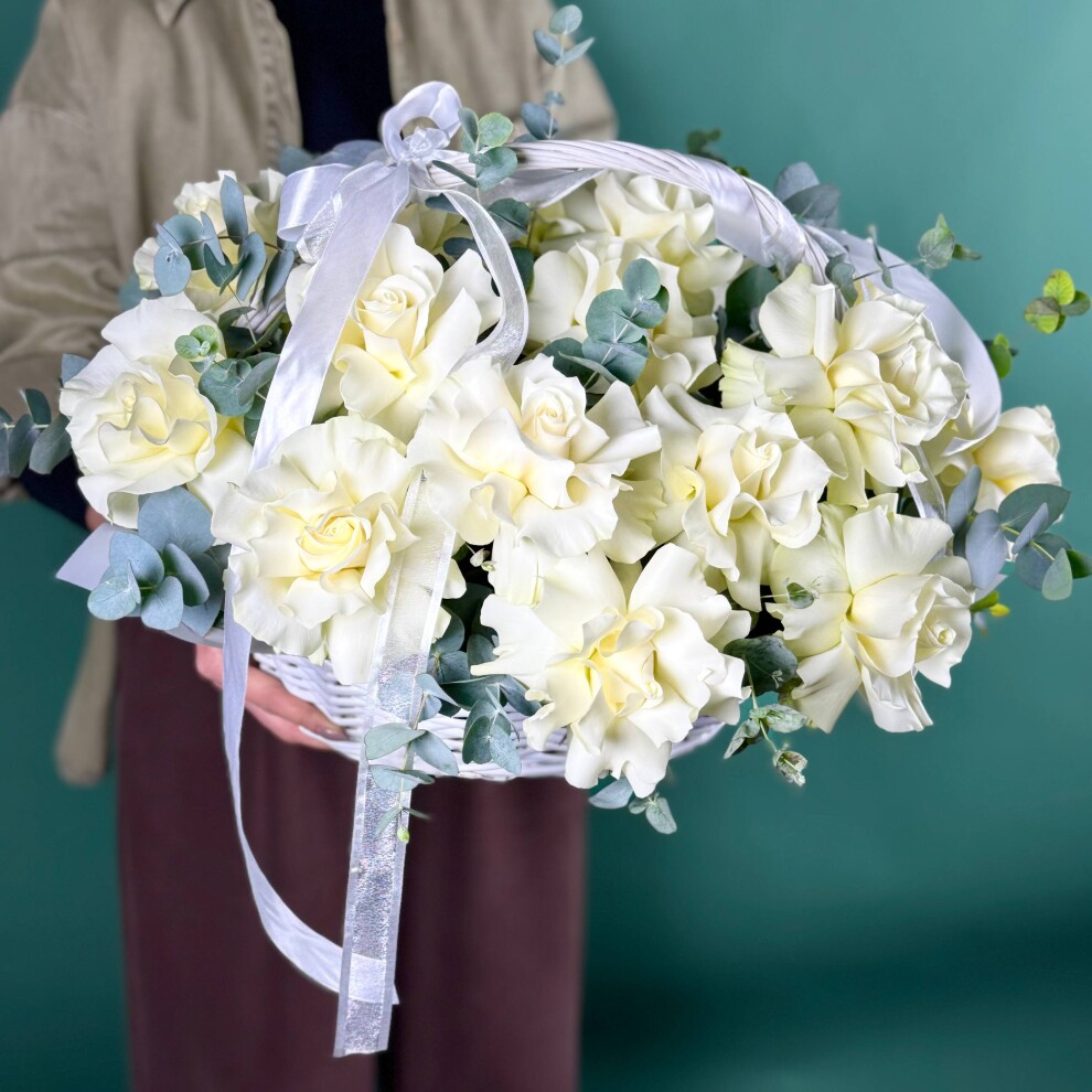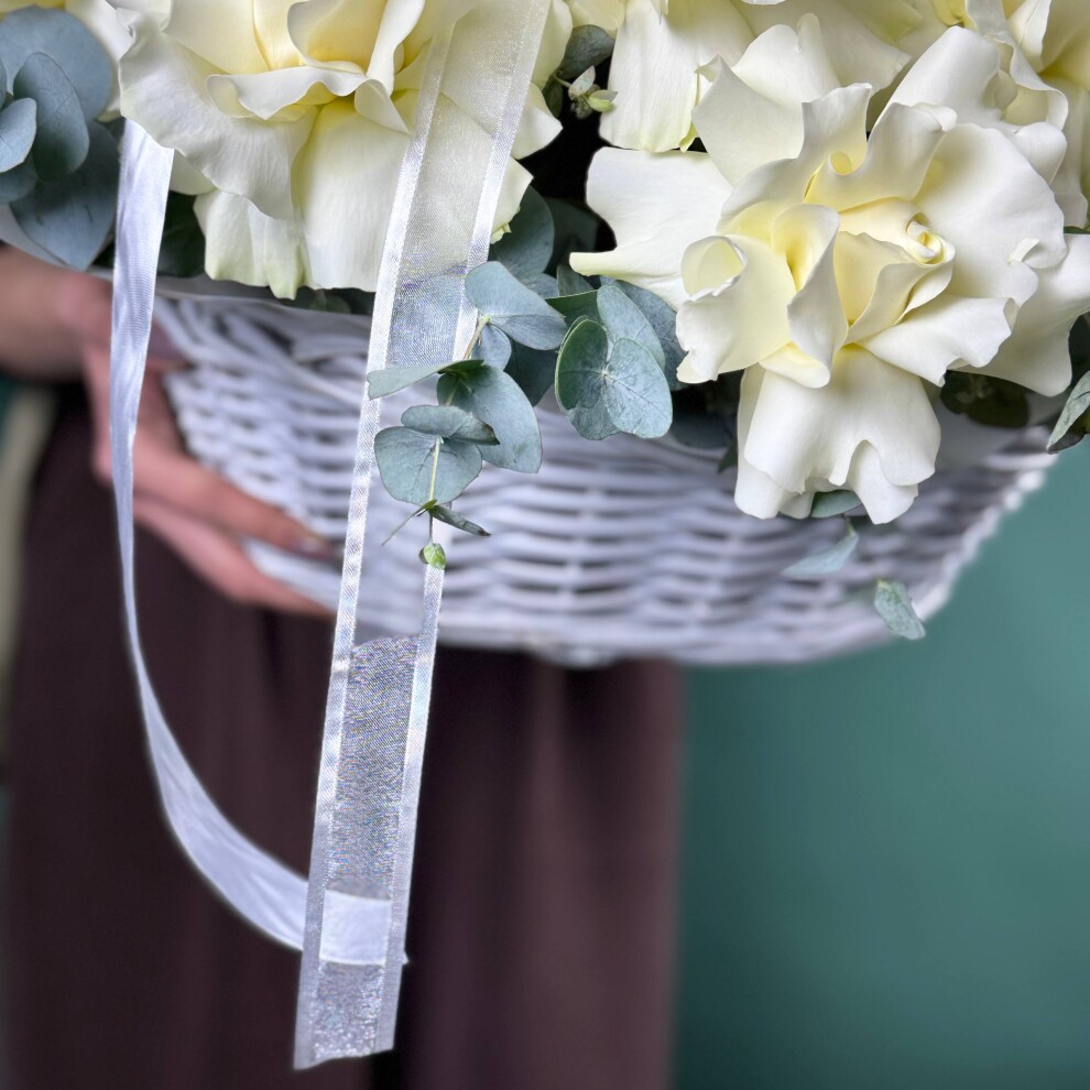 Этот букет — воплощение утончённой элегантности и чистоты! Нежные белые розы, собранные в стильную плетёную корзину, создают ощущение лёгкости и изысканности, будто сама весна решила поселиться в этом цветочном ансамбле.