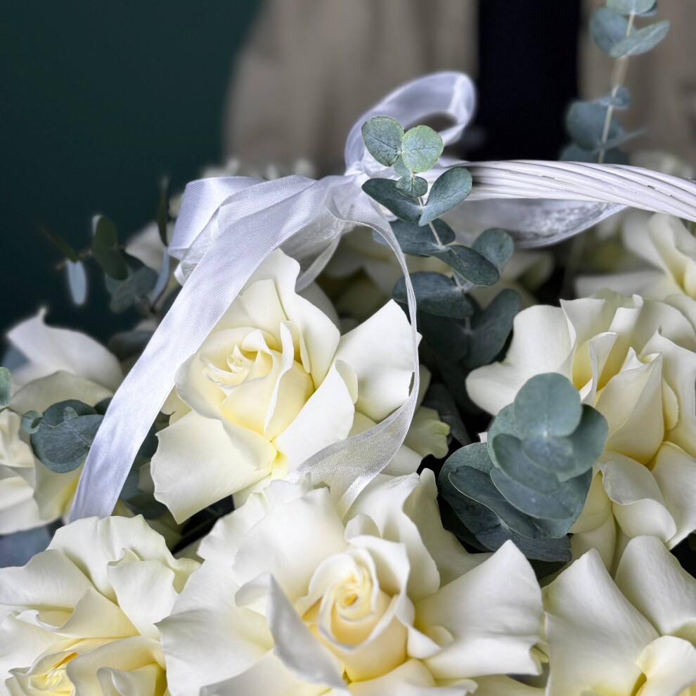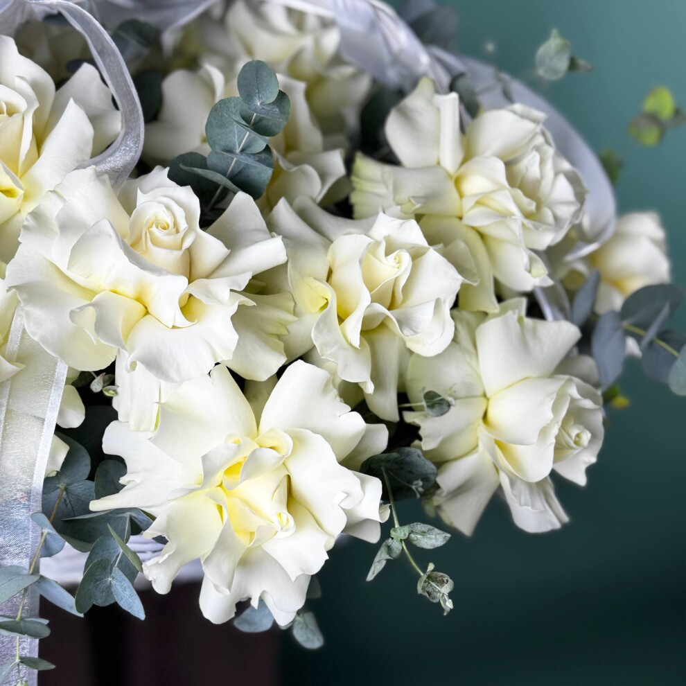 Дополняют композицию изящные веточки эвкалипта с серебристо-зелёными листьями. Они придают букету воздушность и лёгкую прохладу, создавая идеальный контраст с благородной белизной роз. Эвкалипт словно обрамляет цветы, подчёркивая их изысканность и чистоту линий.