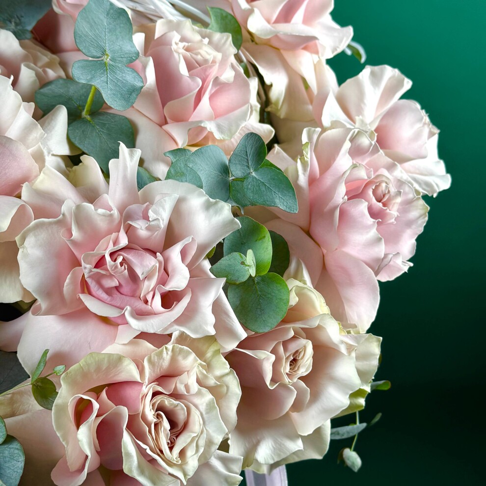 Среди роз уютно расположились веточки эвкалипта с округлыми серебристо-зелёными листьями. Они добавляют композиции лёгкость, свежесть и изысканный контраст, подчёркивая нежность розовых лепестков.