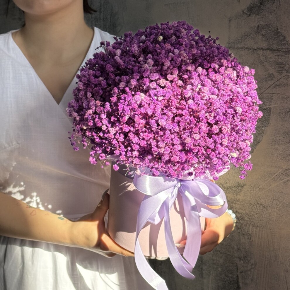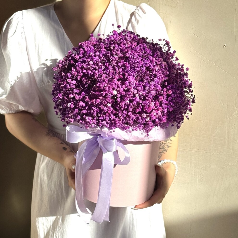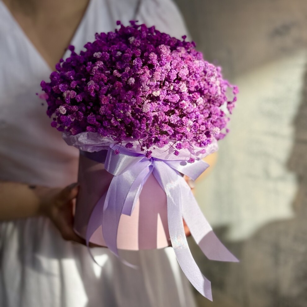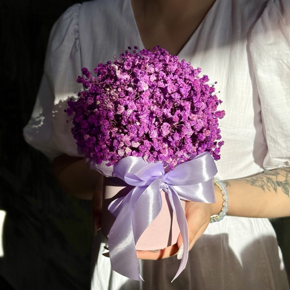 Шляпная коробка с фиолетовой стабилизированной Гипсофилой