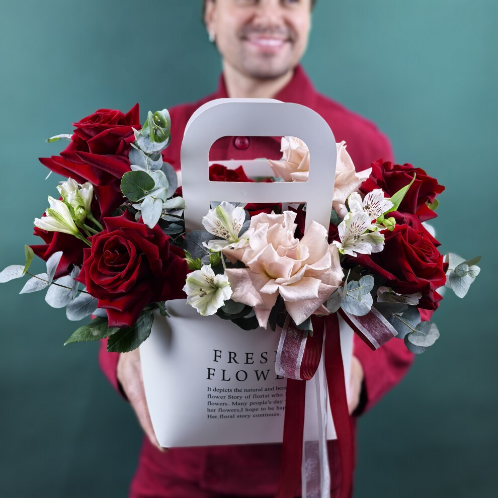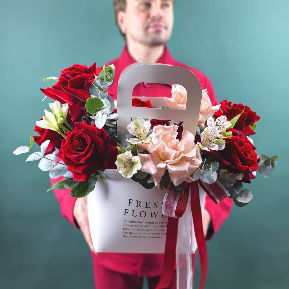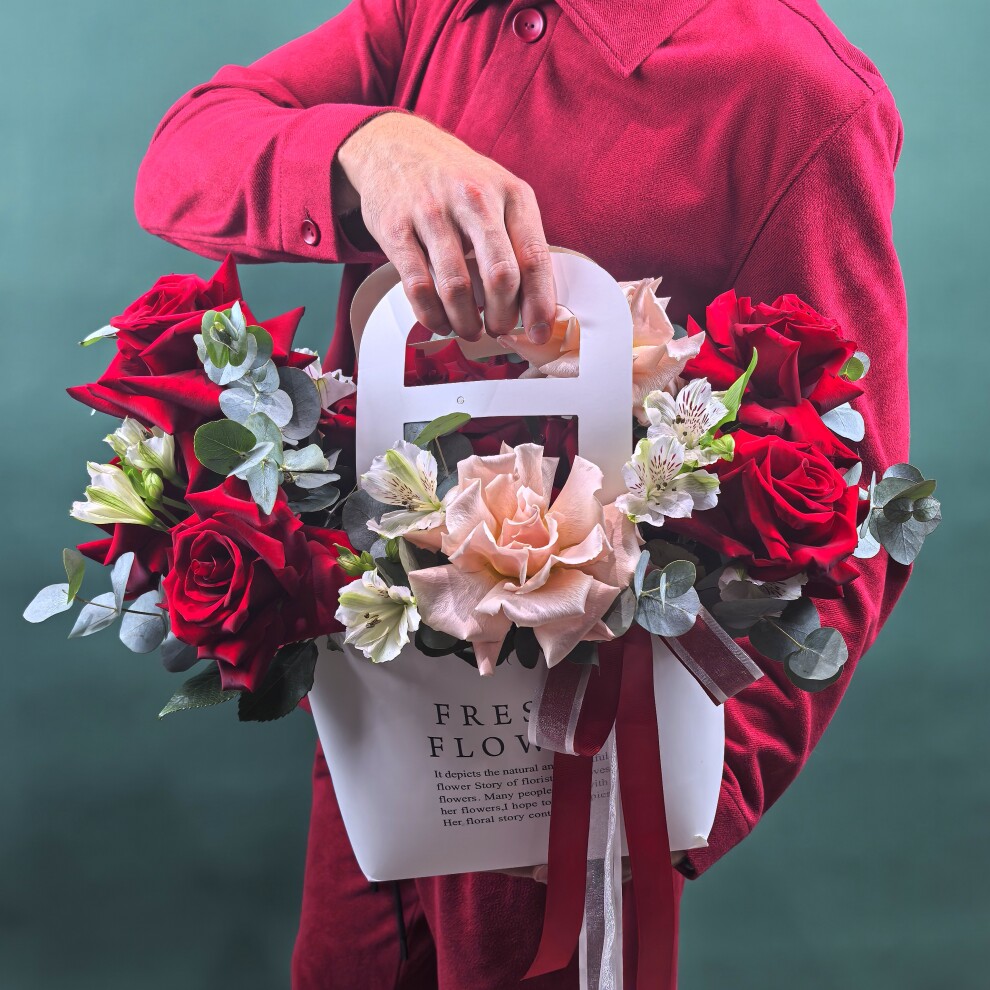 В центре внимания — изысканные французские розы насыщенного красного цвета, которые гармонично сочетаются с нежными розовыми пионами и белоснежными альстромериями.
