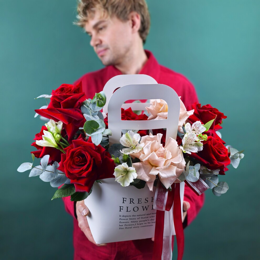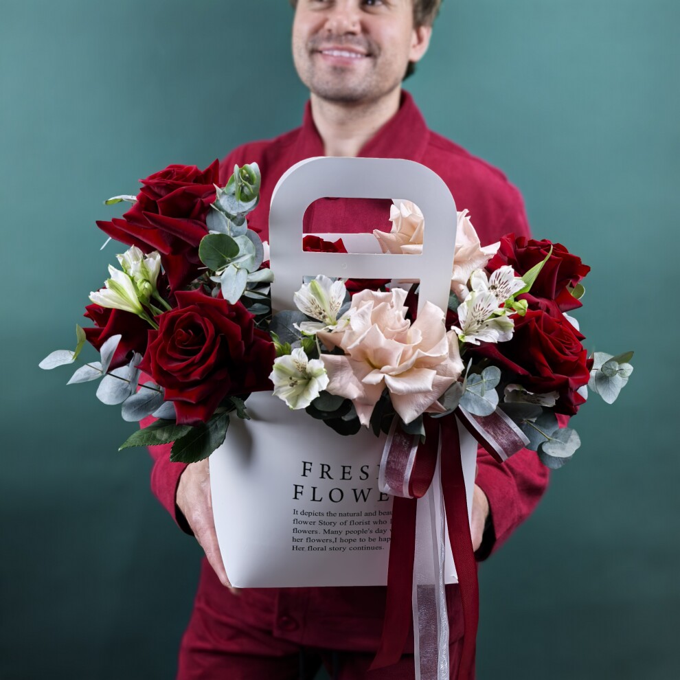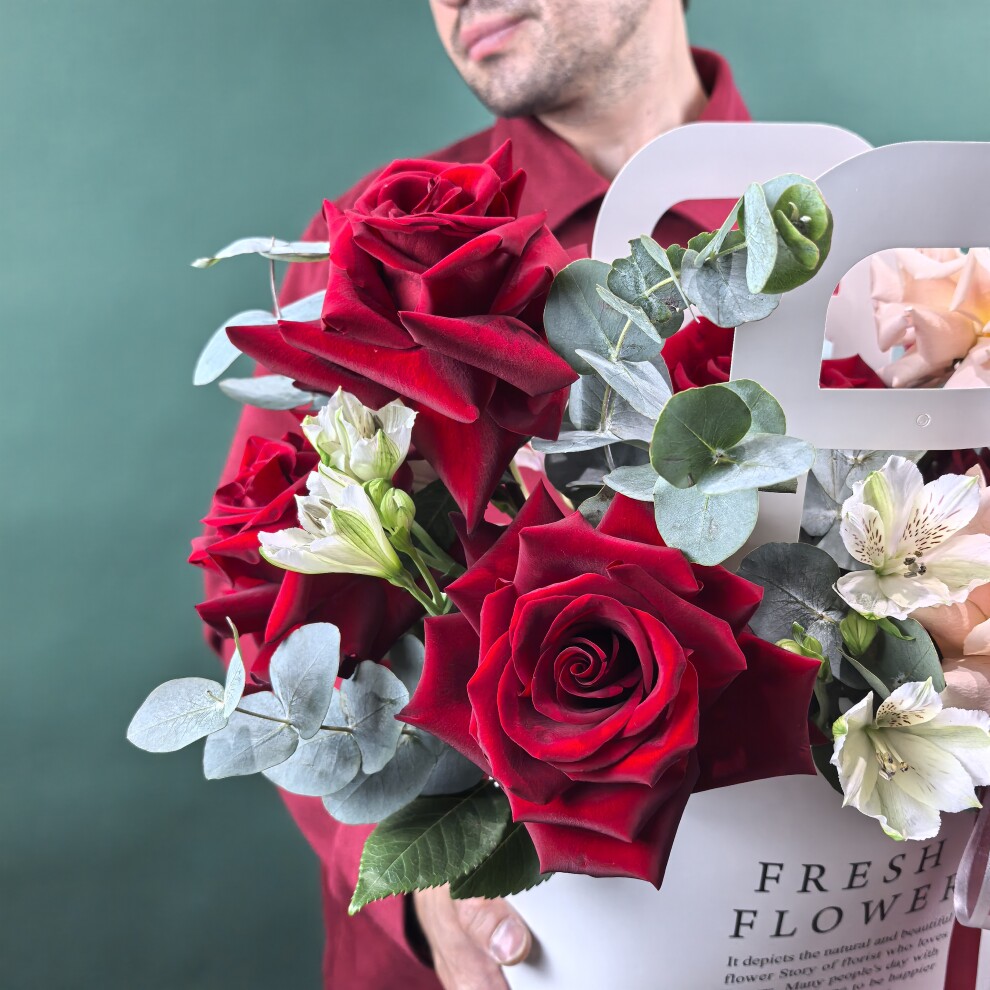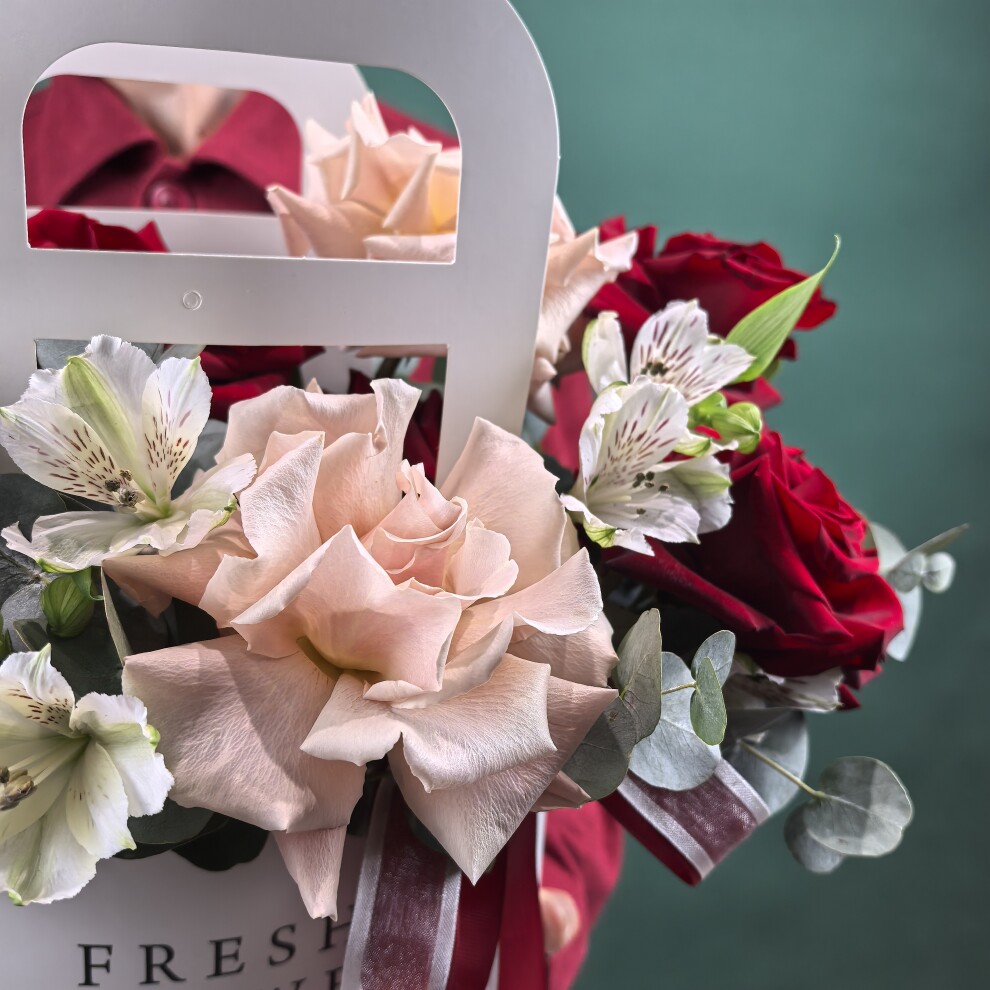 Букет представлен в стильной коробке с надписью «FRES FLOWER», что подчёркивает его свежесть и качество. Элегантная лента, перевязанная вокруг коробки, добавляет изысканности и делает композицию ещё более привлекательной.