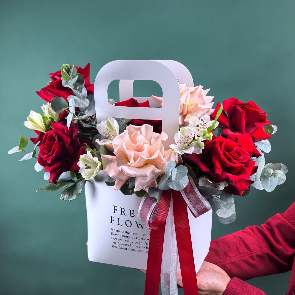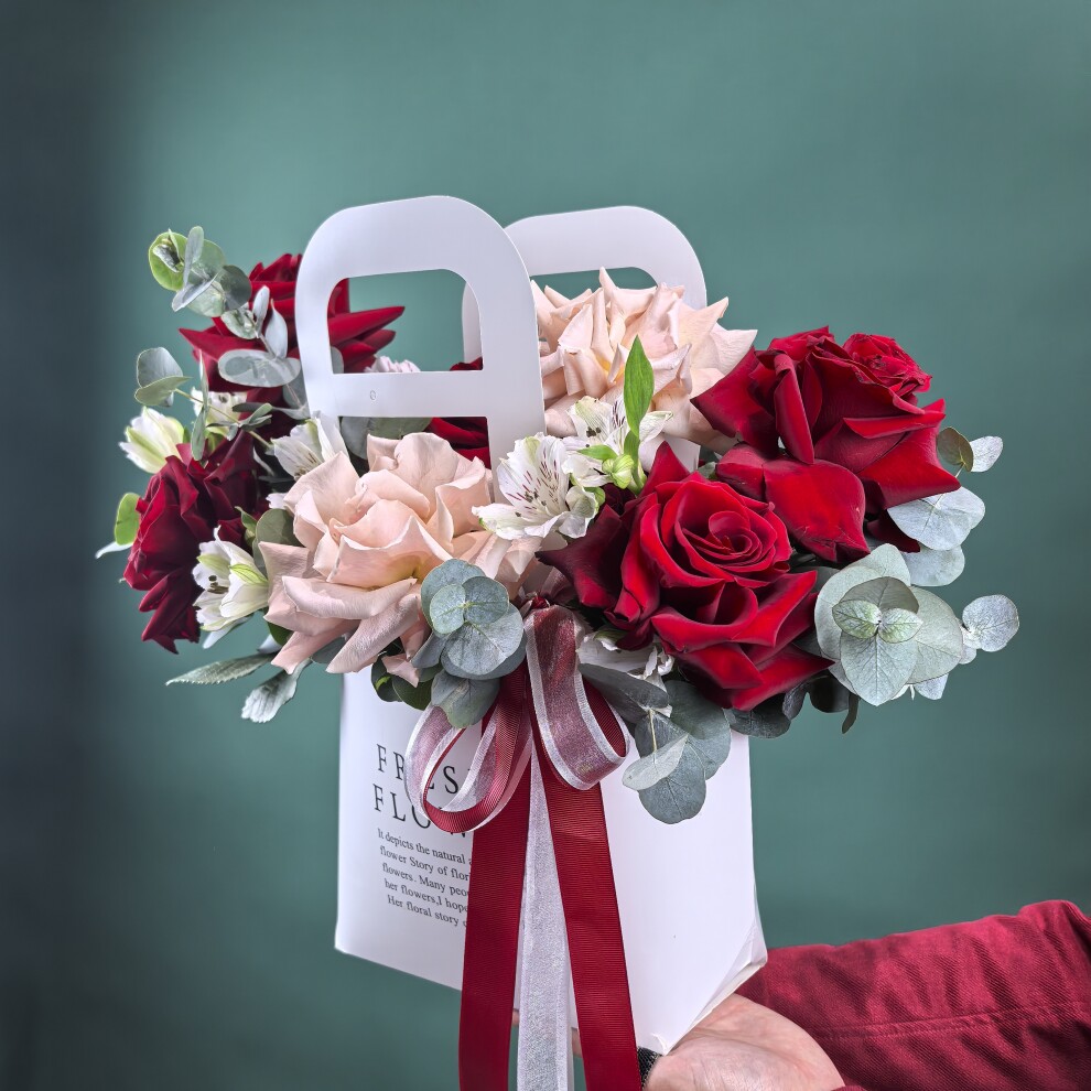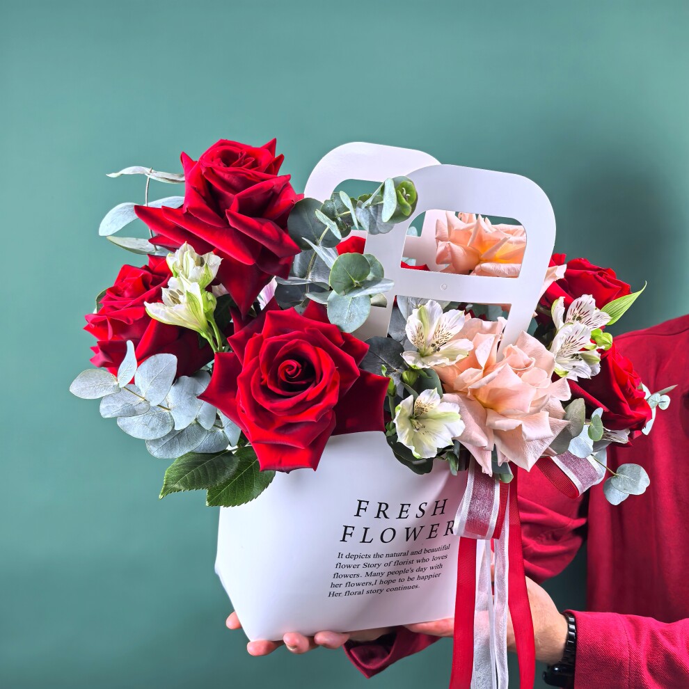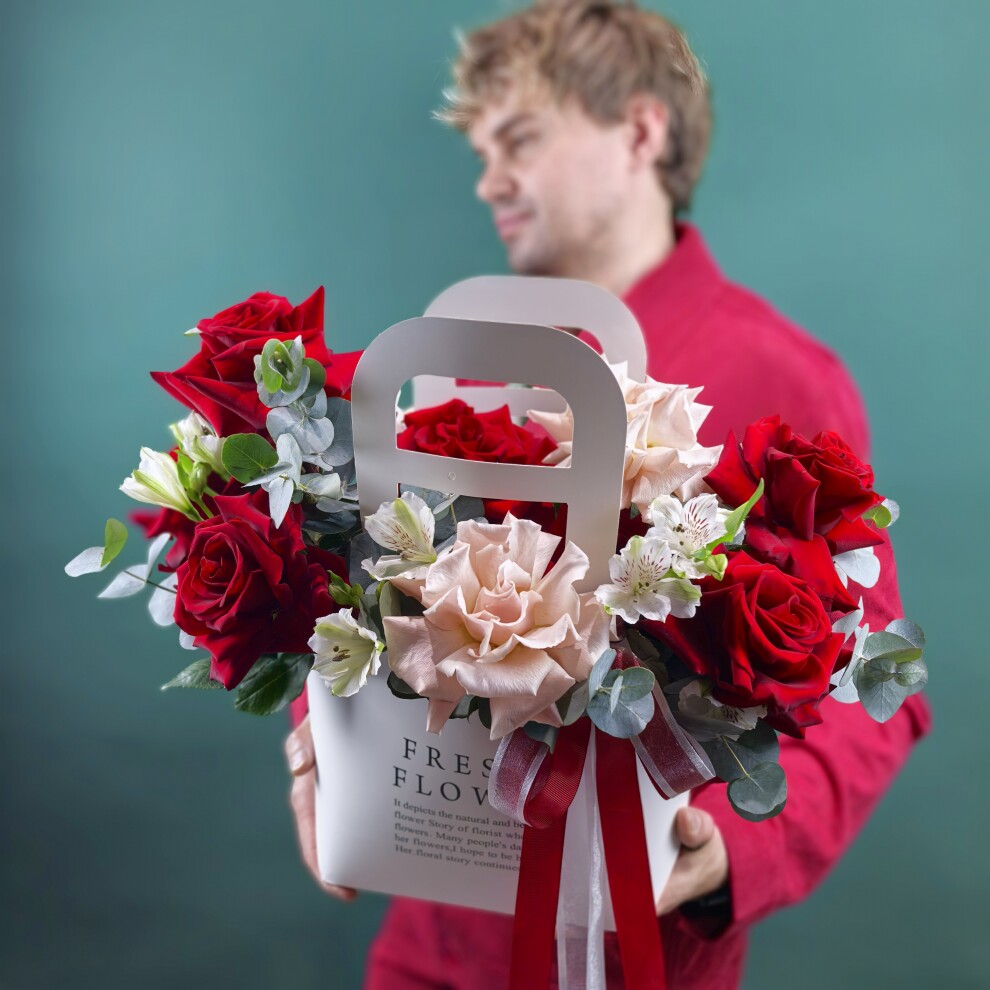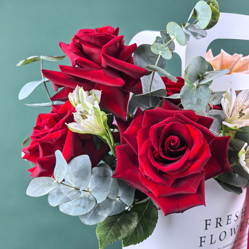 Букет представлен в стильной коробке с надписью «FRES FLOWER», что подчёркивает его свежесть и качество. Элегантная лента, перевязанная вокруг коробки, добавляет изысканности и делает композицию ещё более привлекательной.