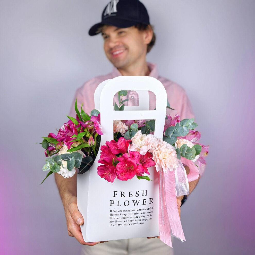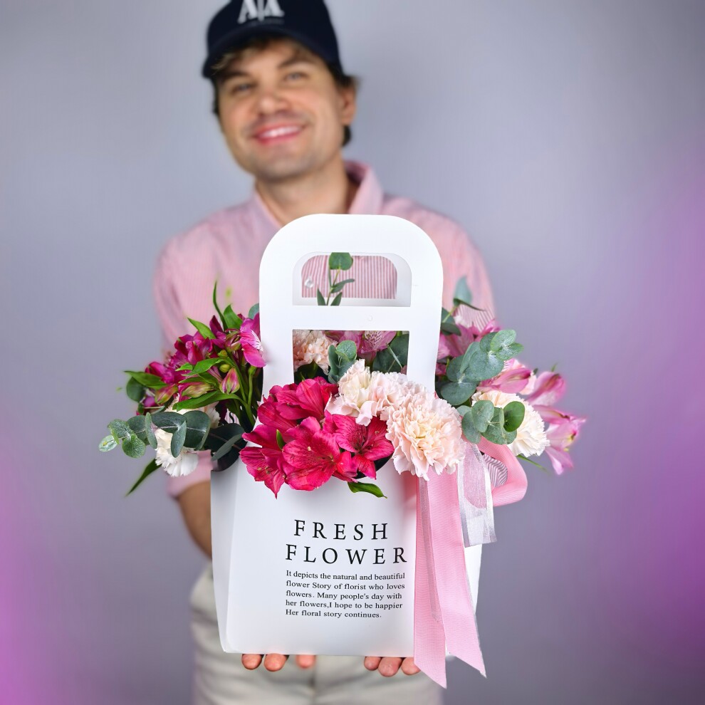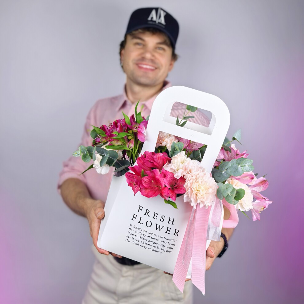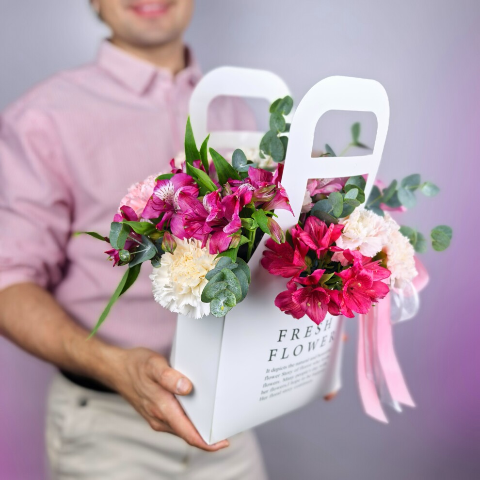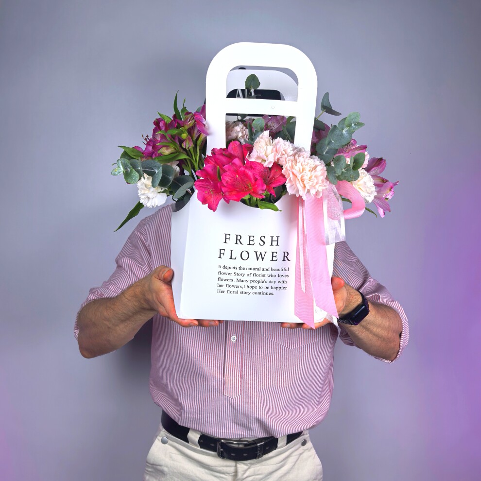 Эта цветочная композиция в стильной сумочке воплощение нежности и утонченности.