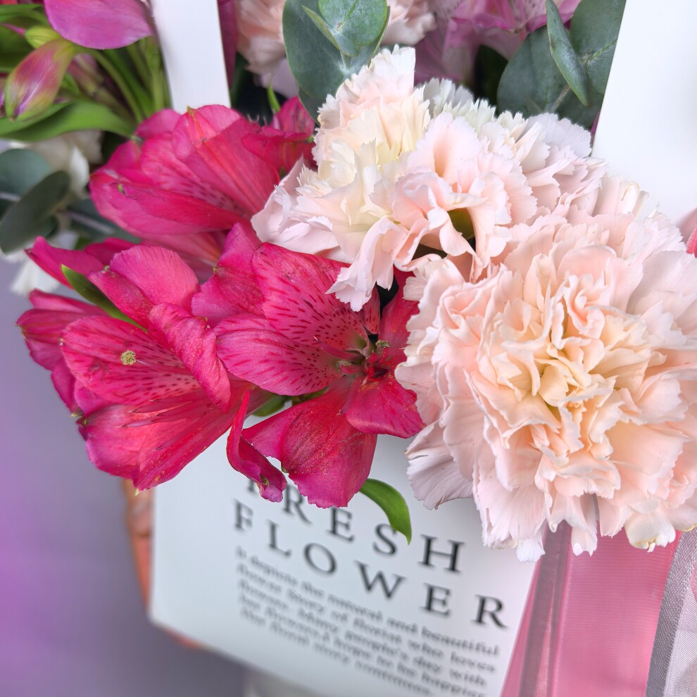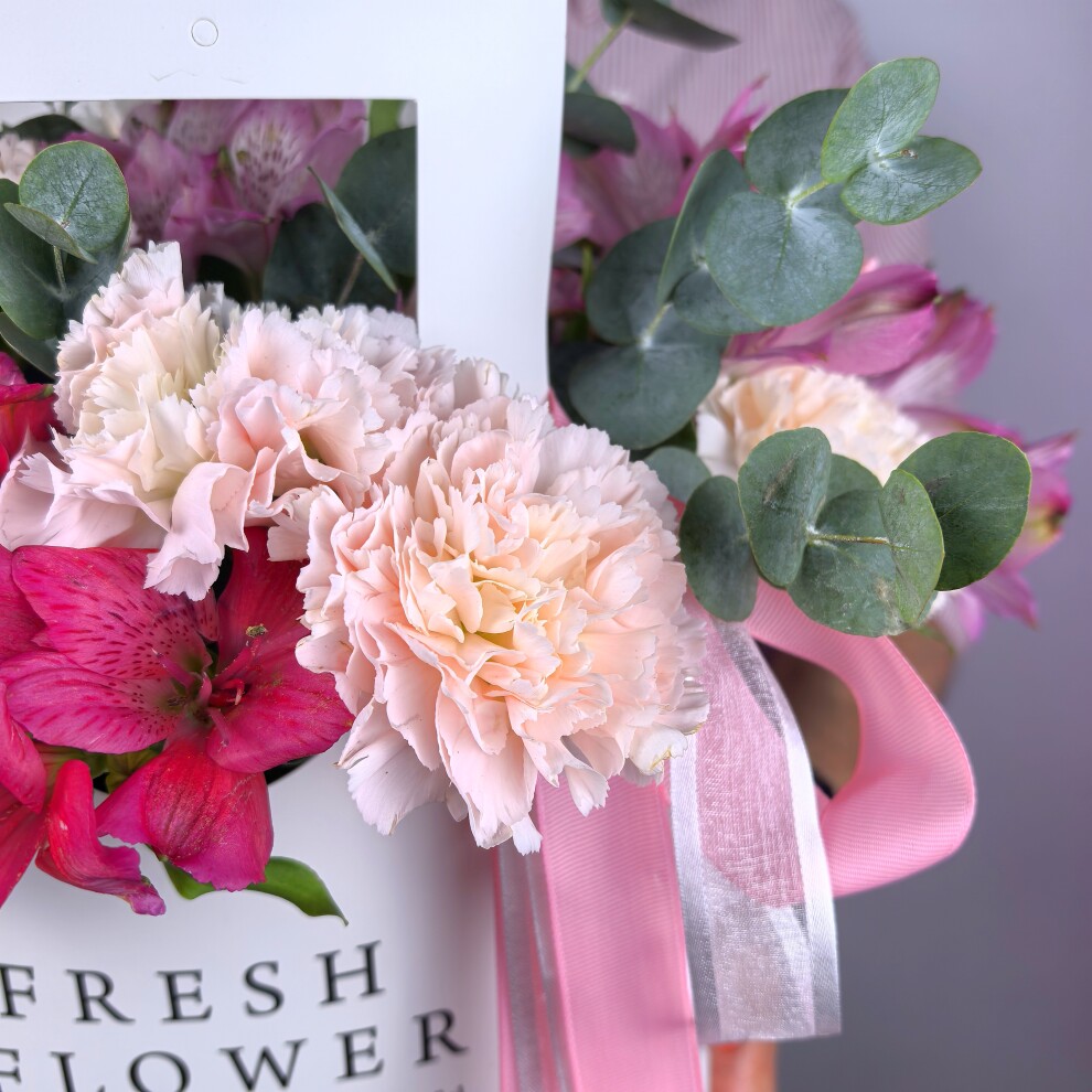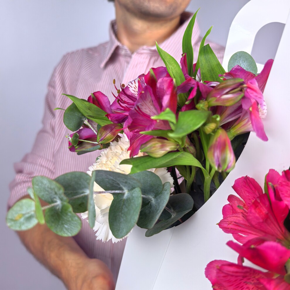 Яркие розовые альстромерии гармонично сочетаются с нежными гвоздиками, создавая атмосферу радости и тепла.