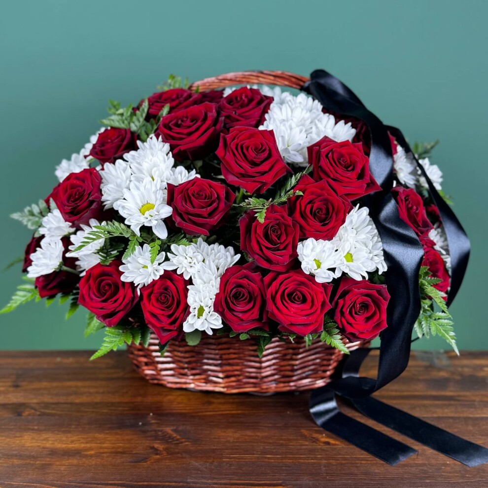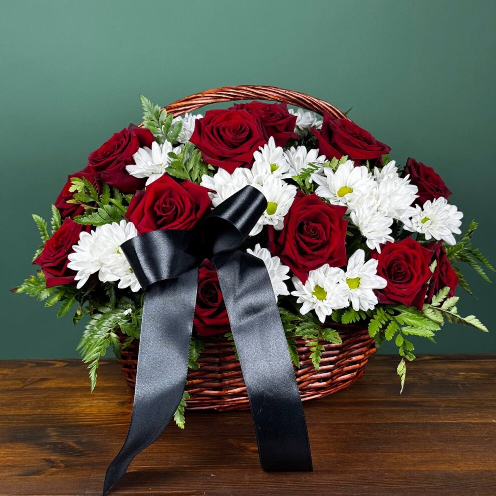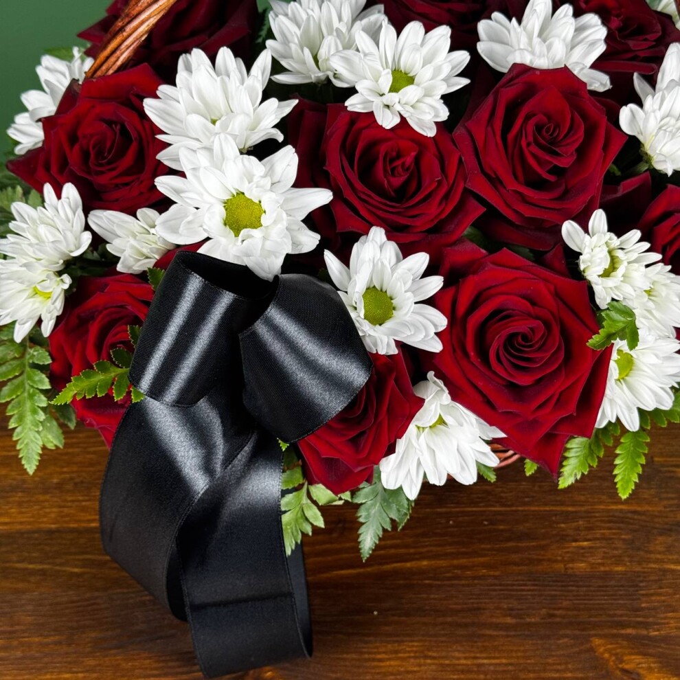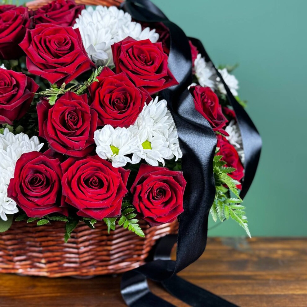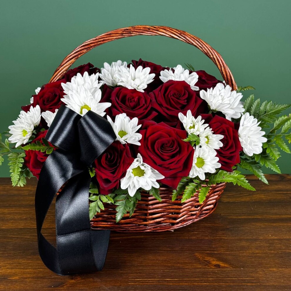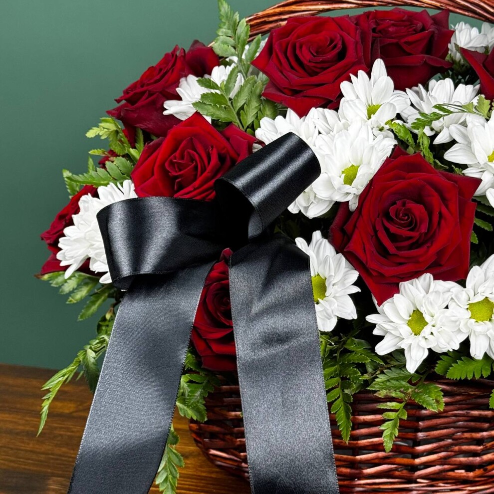 В плетёной корзине собраны тёмно-красные розы, символизирующие глубокую скорбь и уважение, а также белые хризантемы, которые олицетворяют чистоту и невинность.