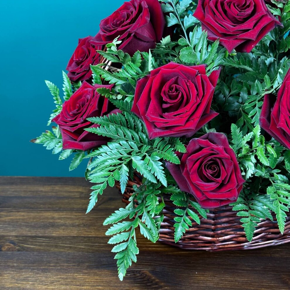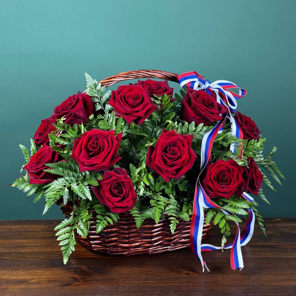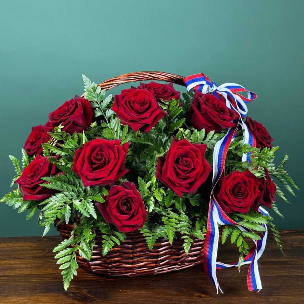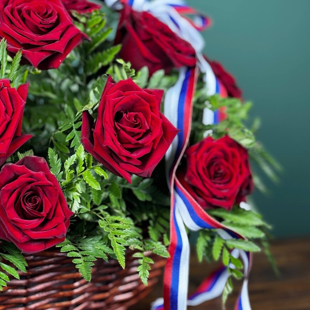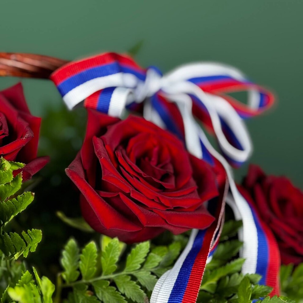 В плетёной корзине собраны тёмно-красные розы, символизирующие глубокую скорбь и уважение, а также белые хризантемы, которые олицетворяют чистоту и невинность.