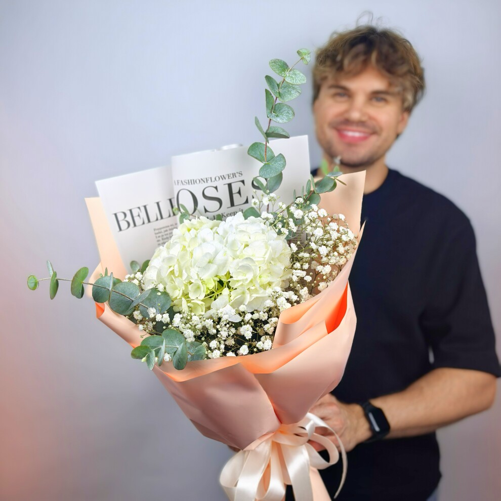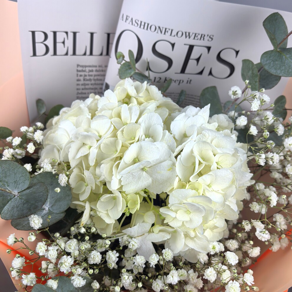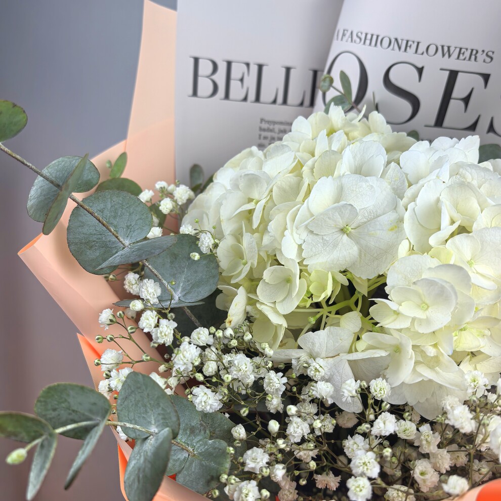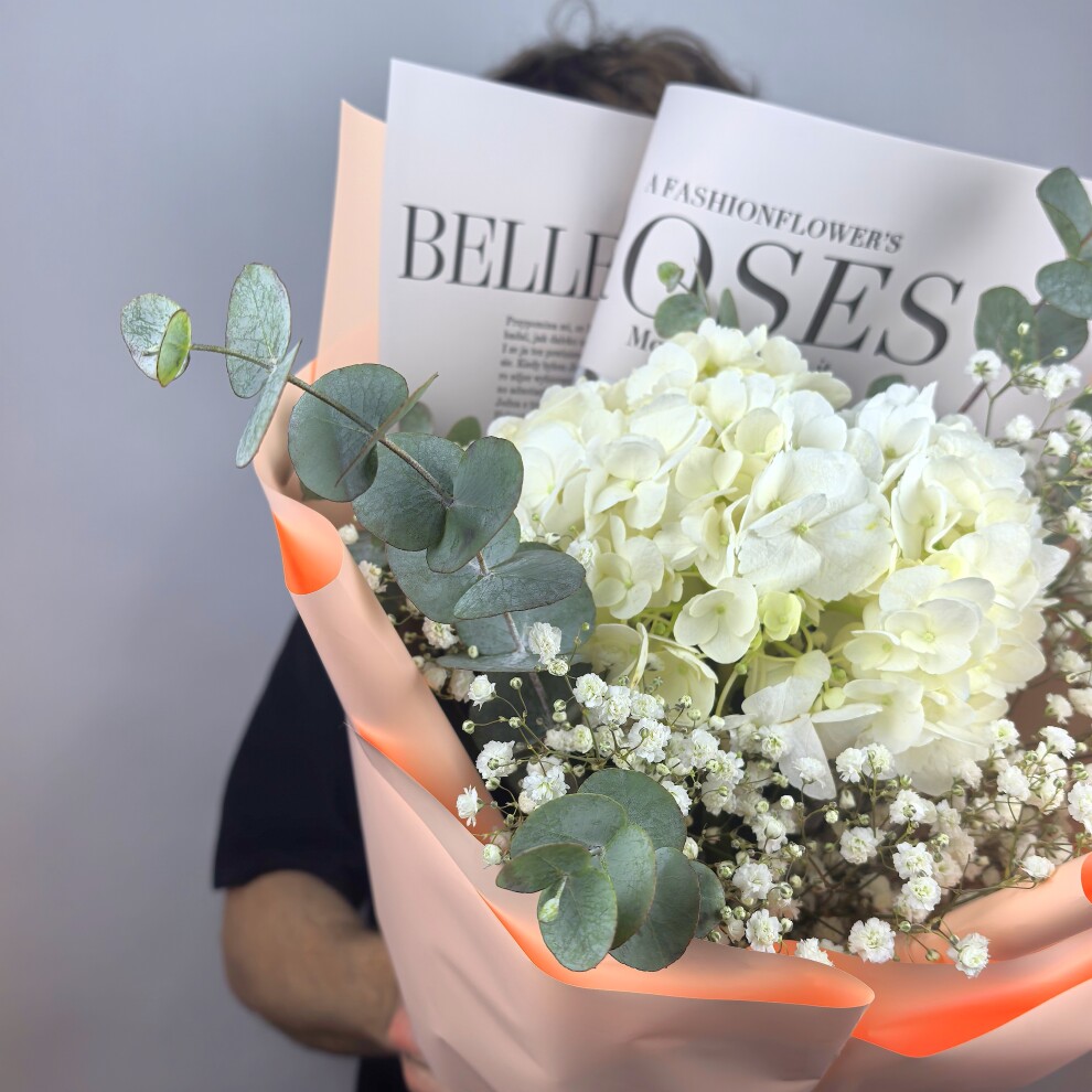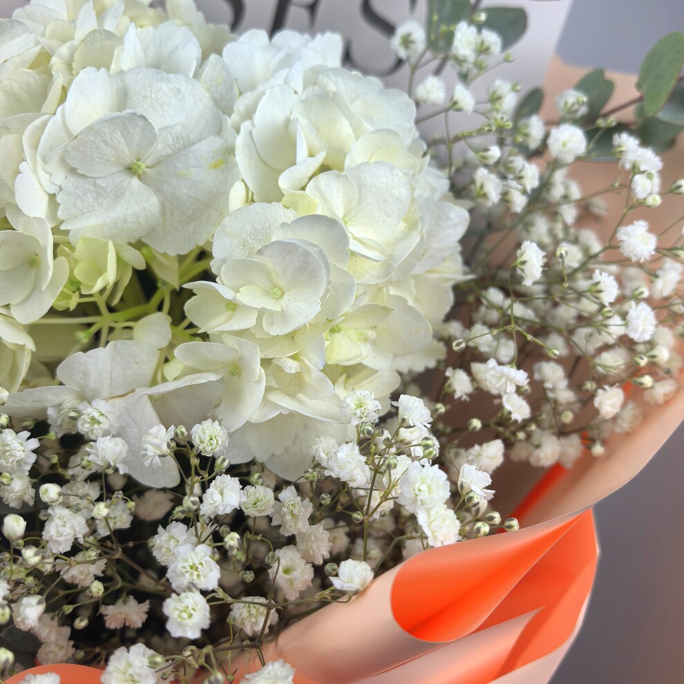 Этот букет — воплощение нежности и утончённости. Белые гортензии, словно облачка, создают ощущение лёгкости и чистоты. Их окружили мелкие белые цветы гипсофилы, добавляющие композиции воздушности и романтики. Веточки эвкалипта с серебристыми листьями придают букету свежесть и природную гармонию. Всё это завернуто в нежную персиковую упаковку, которая подчёркивает мягкость и изысканность композиции. Такой букет станет идеальным подарком для тех, кто ценит красоту в простоте и естественности.