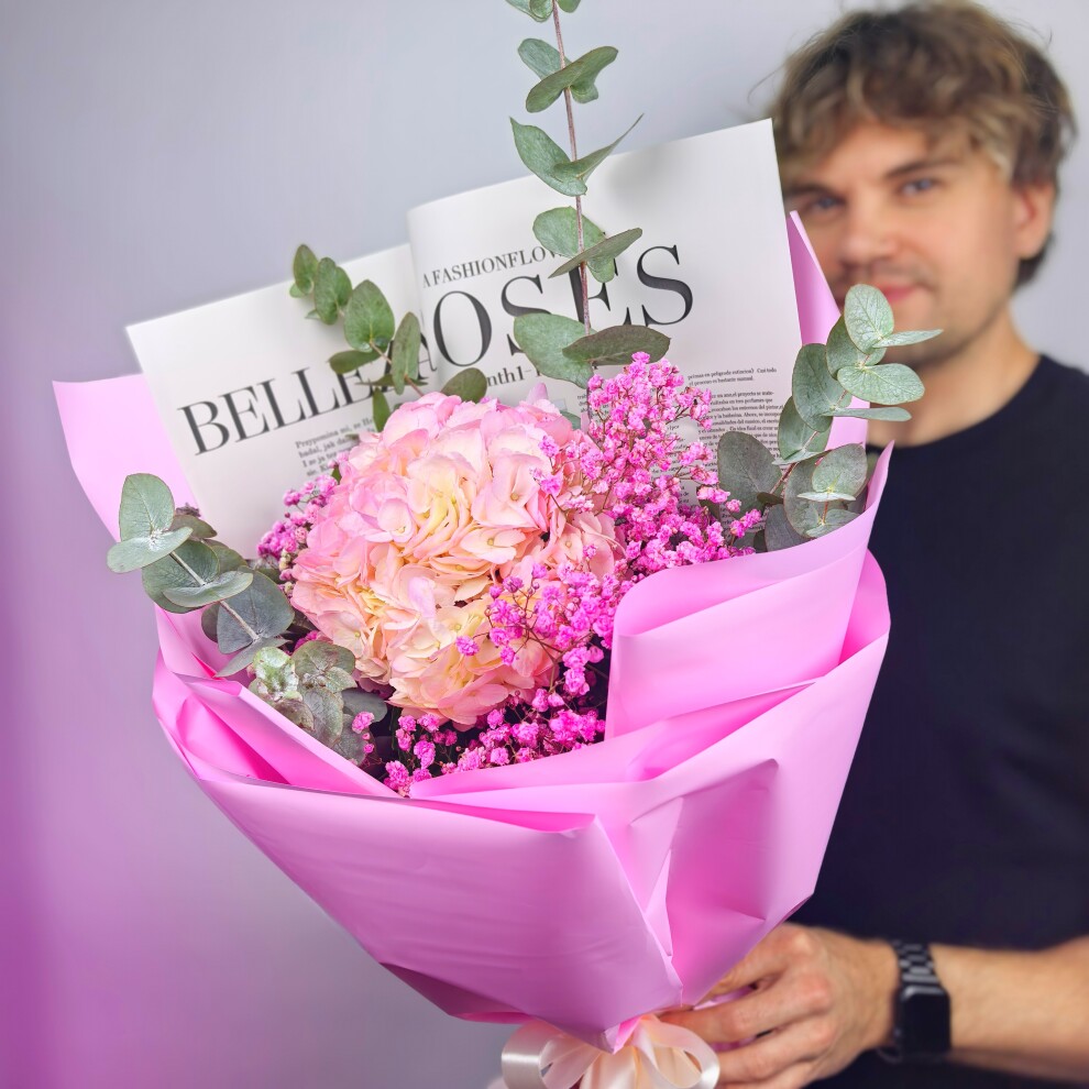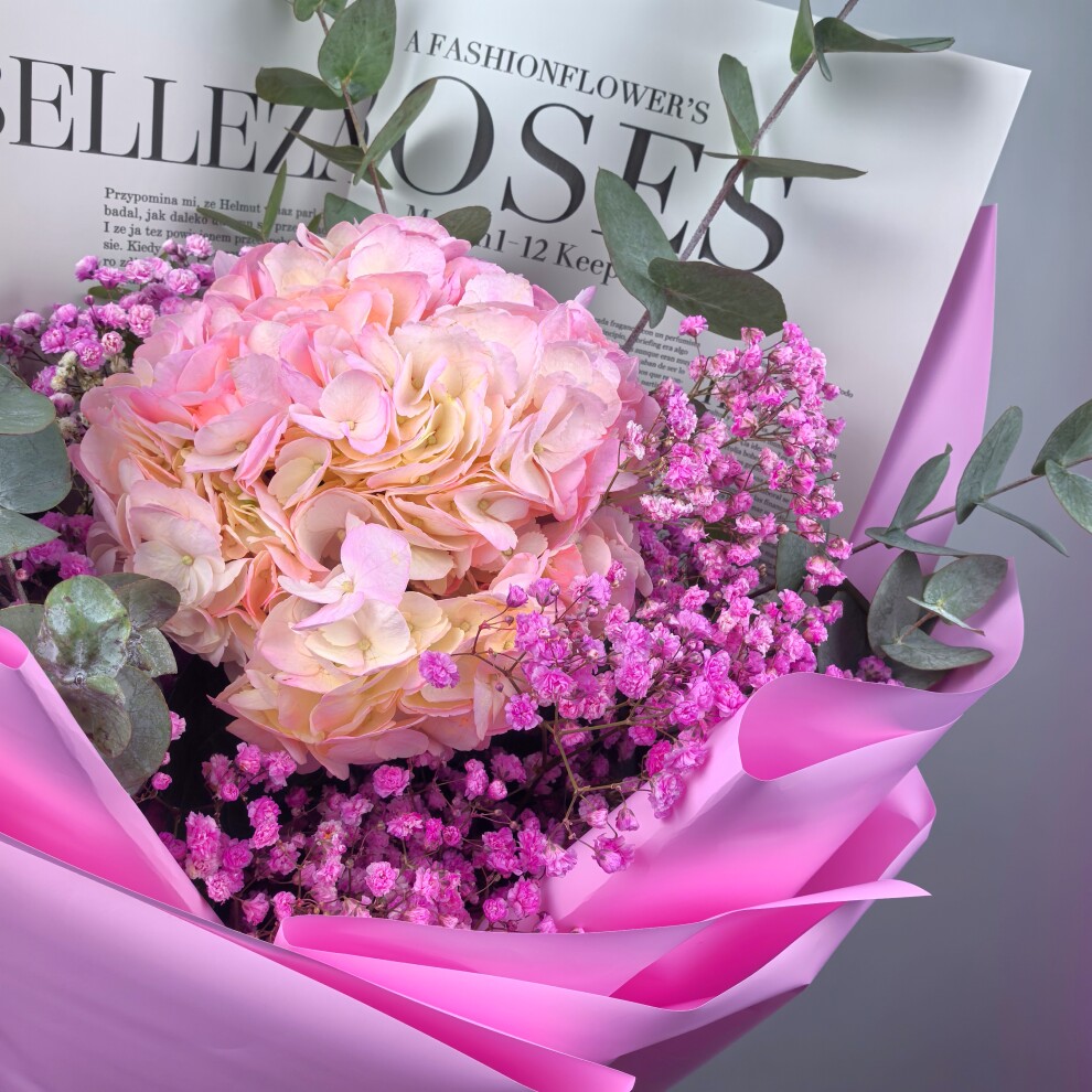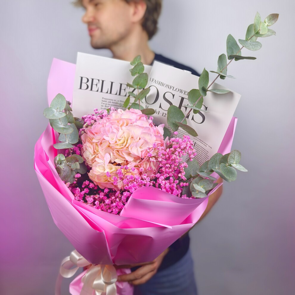 Этот букет — воплощение нежности и утончённости. Розовые гортензии, словно облачка, создают ощущение лёгкости и чистоты. Их окружили мелкие розовые цветы гипсофилы, добавляющие композиции воздушности и романтики. Веточки эвкалипта с серебристыми листьями придают букету свежесть и природную гармонию. Всё это завернуто в нежную персиковую упаковку, которая подчёркивает мягкость и изысканность композиции. Такой букет станет идеальным подарком для тех, кто ценит красоту в простоте и естественности.