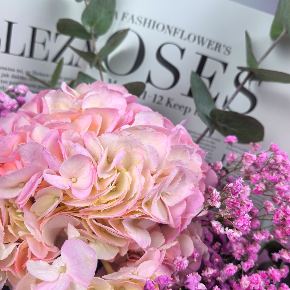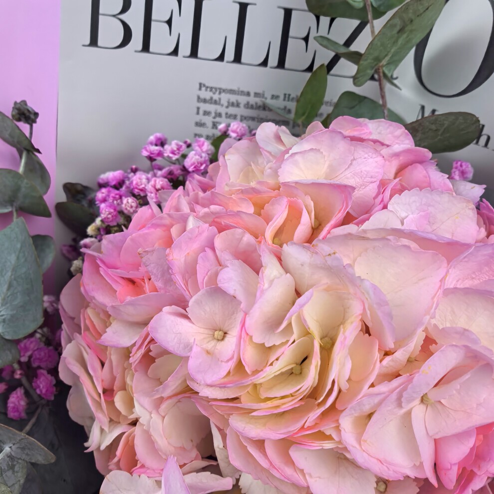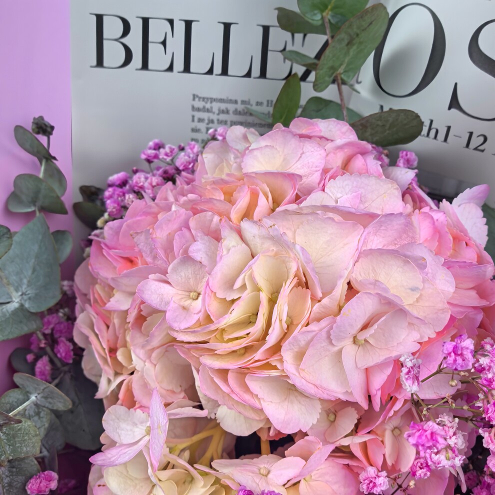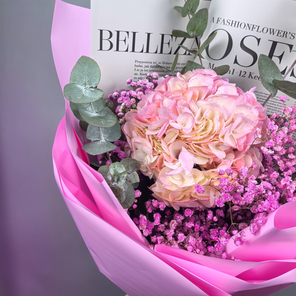Этот букет — воплощение нежности и утончённости. Розовые гортензии, словно облачка, создают ощущение лёгкости и чистоты. Их окружили мелкие розовые цветы гипсофилы, добавляющие композиции воздушности и романтики. Веточки эвкалипта с серебристыми листьями придают букету свежесть и природную гармонию. Всё это завернуто в нежную персиковую упаковку, которая подчёркивает мягкость и изысканность композиции. Такой букет станет идеальным подарком для тех, кто ценит красоту в простоте и естественности.