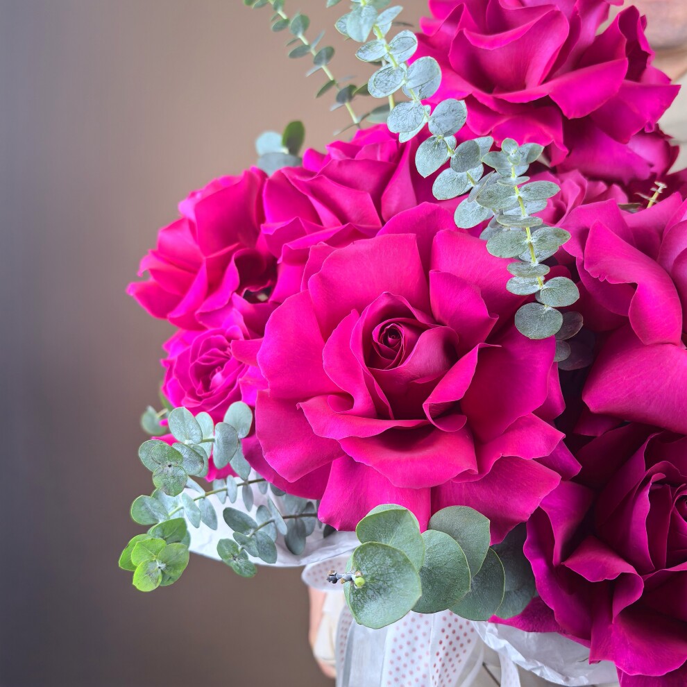 Эта композиция — настоящее произведение искусства, которое завораживает своей яркостью и изысканностью. Малиновые французские розы, словно созданные для того, чтобы покорять сердца, занимают центральное место в букете. Их бархатистые лепестки переливаются на свету, создавая ощущение роскоши и утонченности.