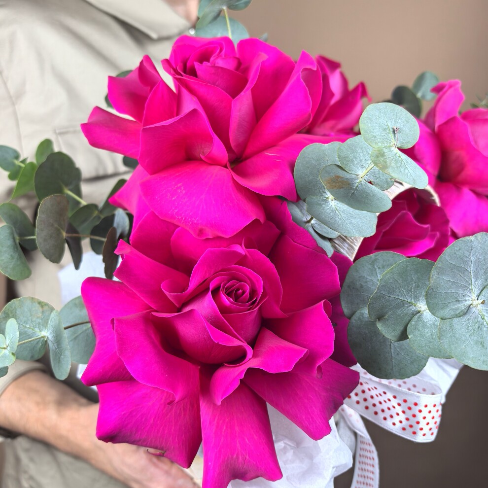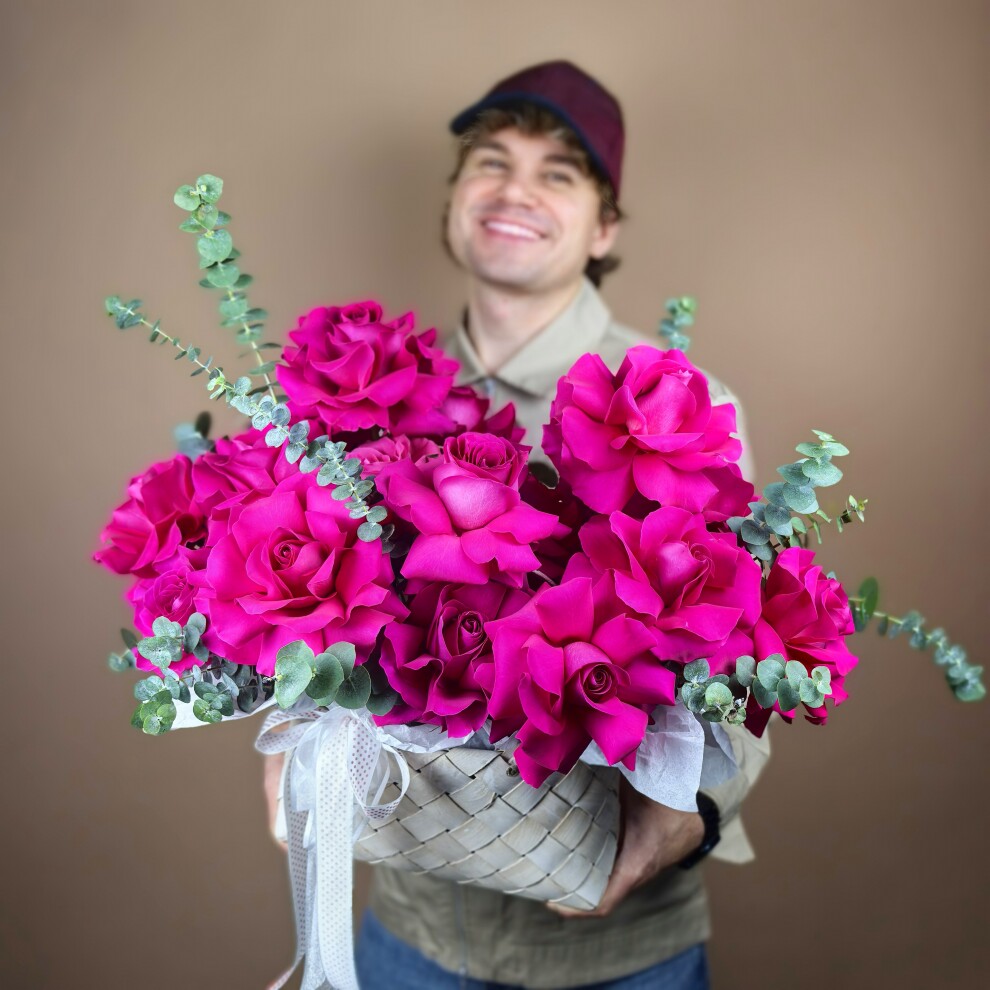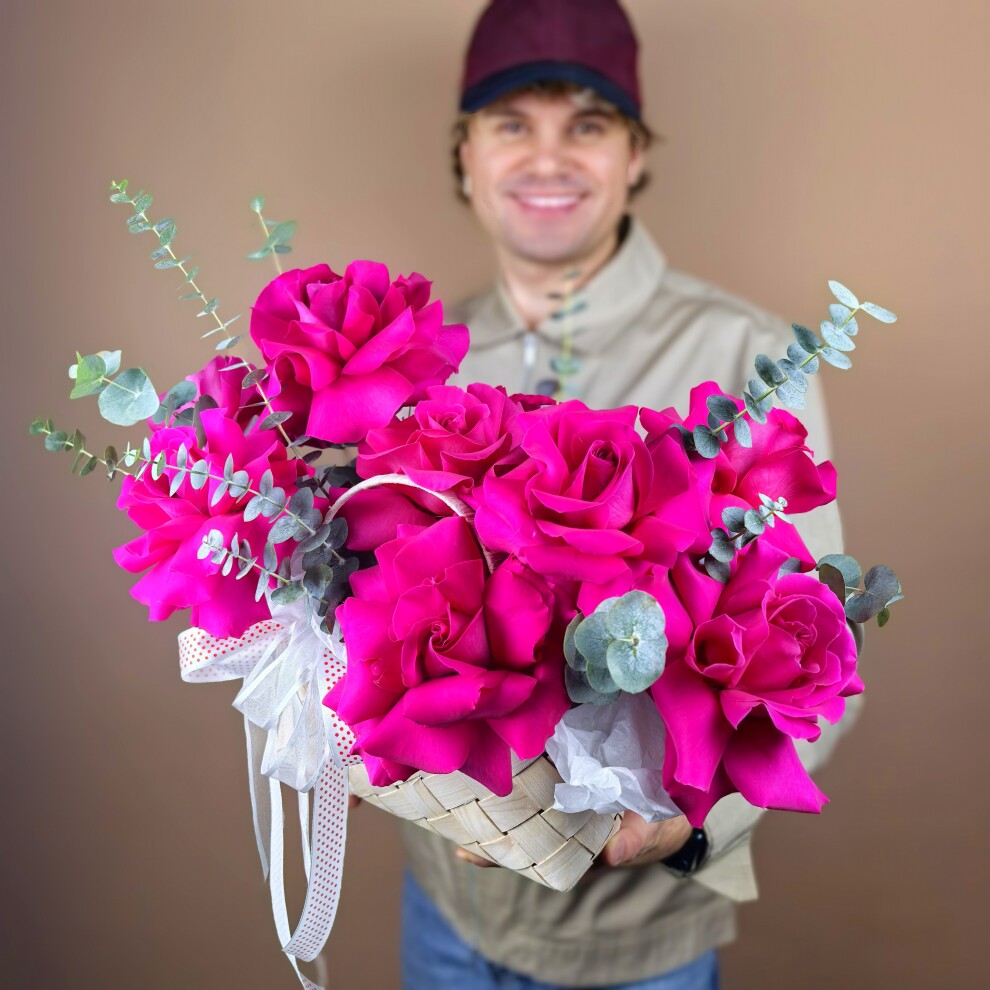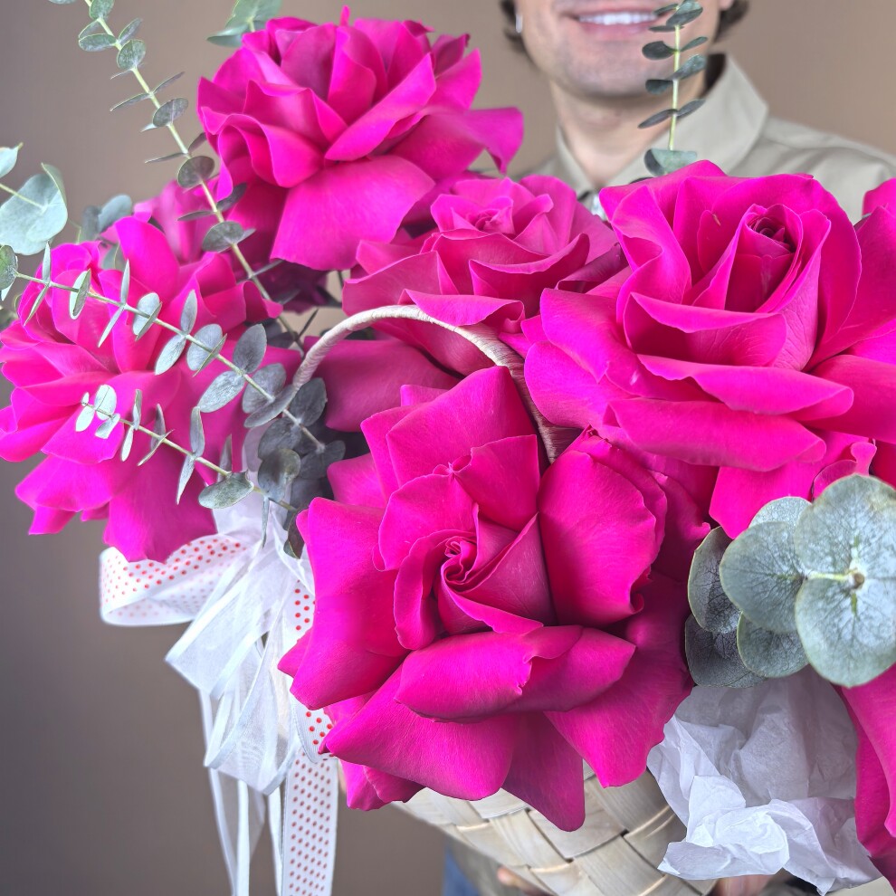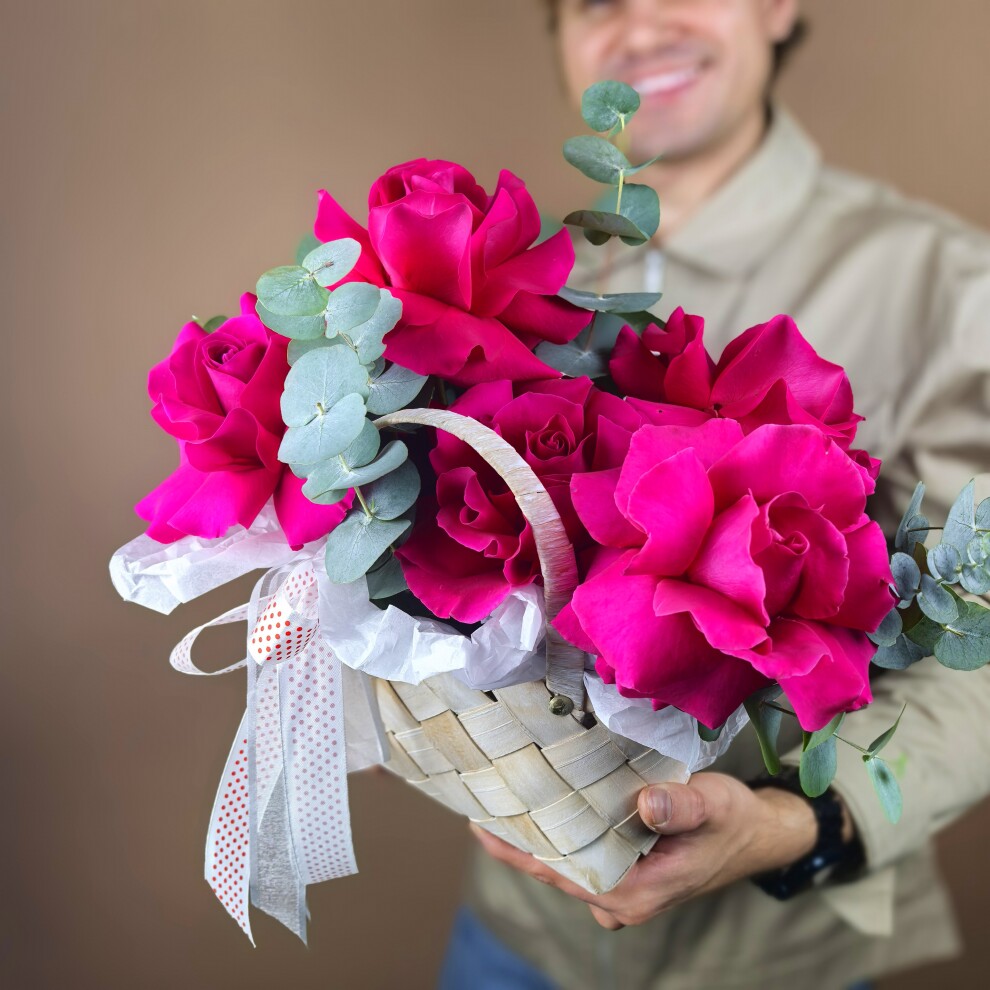 Эвкалипт, аккуратно вплетенный в композицию, добавляет свежести и графичности, создавая гармоничный контраст с яркими цветами. Плетеная корзина, в которой представлена композиция, подчеркивает её элегантность и делает подарок ещё более особенным. Белая лента завершает образ, придавая букету нотку романтики.