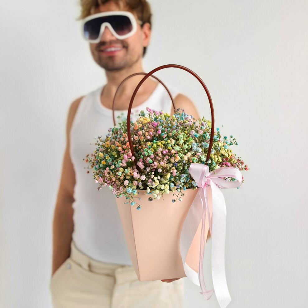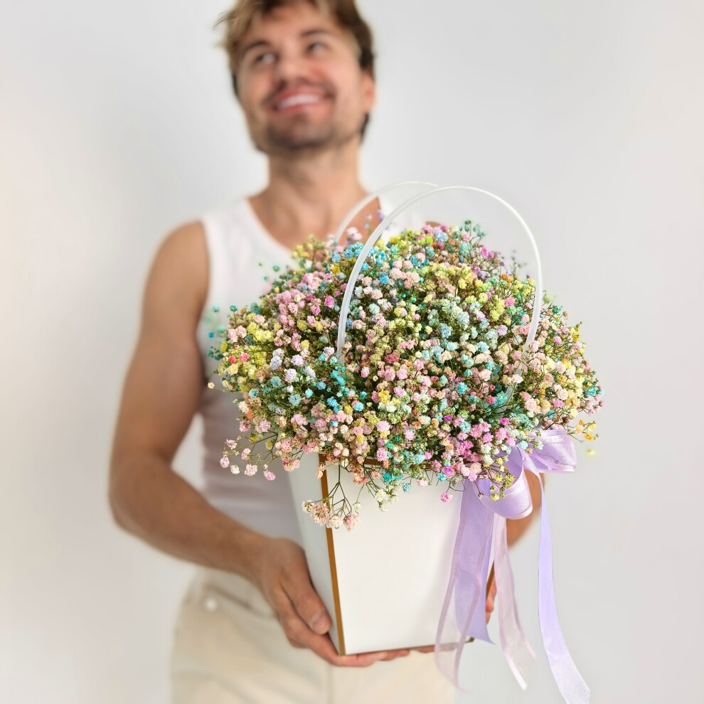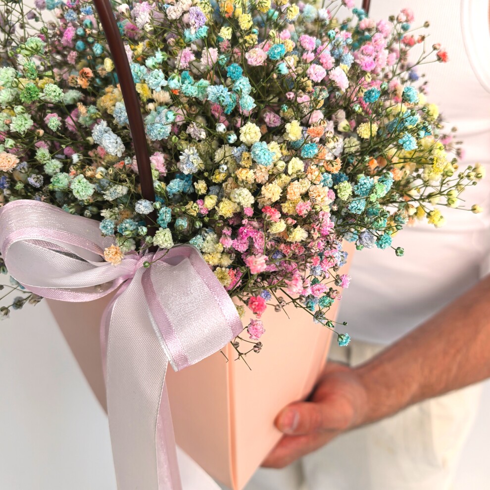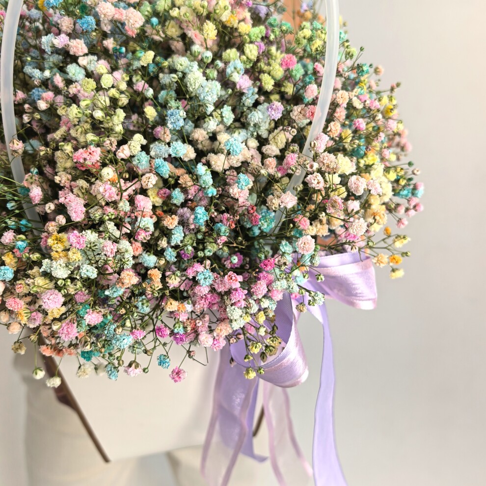 Радужная гипсофила, собранная в пышный букет, создаёт атмосферу лёгкости и весеннего настроения. Нежные оттенки розового, голубого, зелёного и белого гармонично сочетаются, а изящная фиолетовая лента добавляет изысканности.