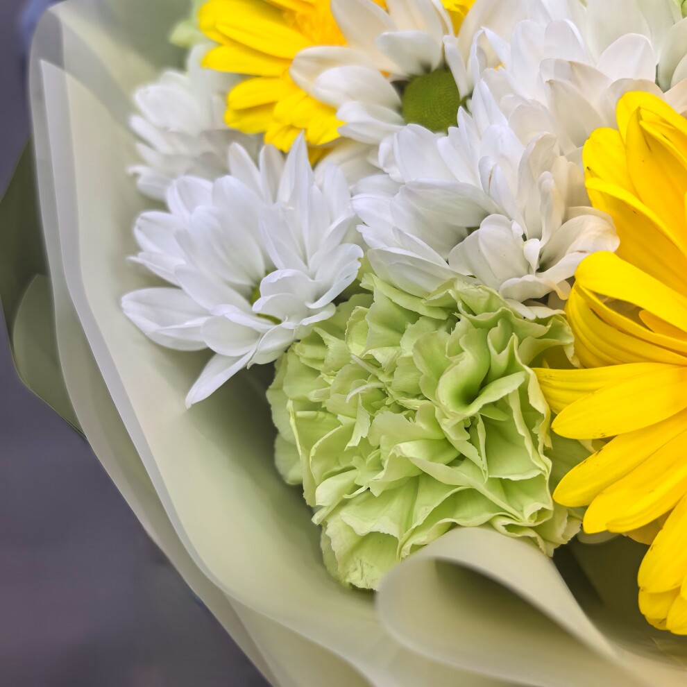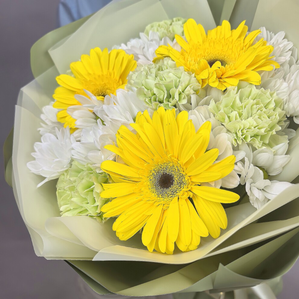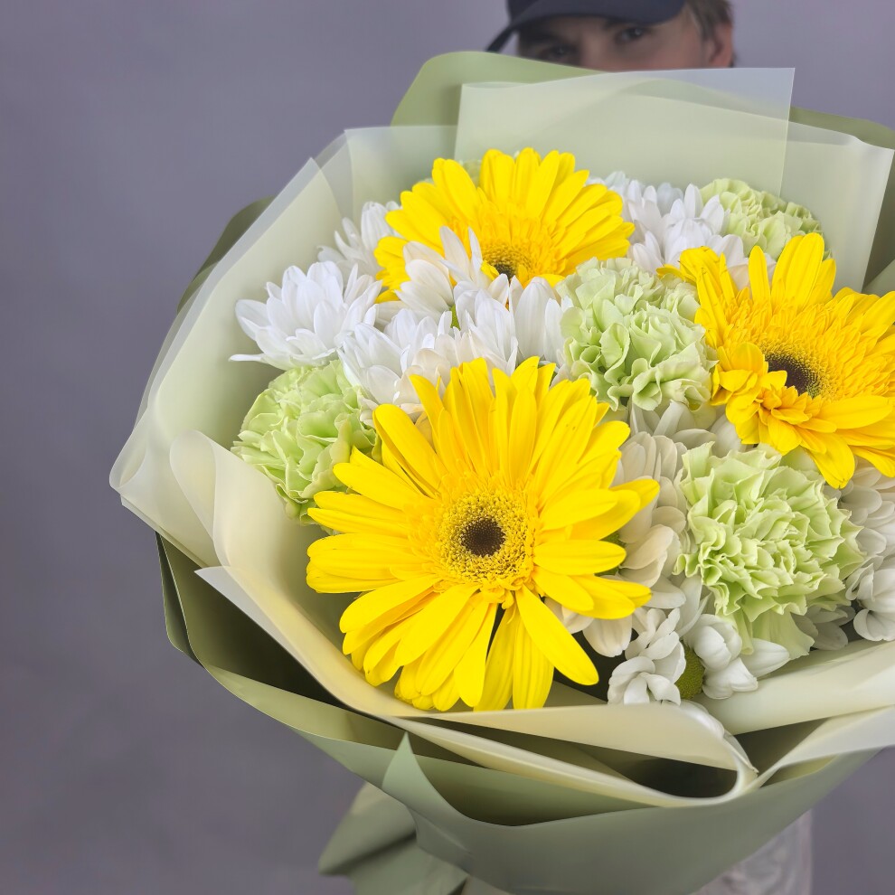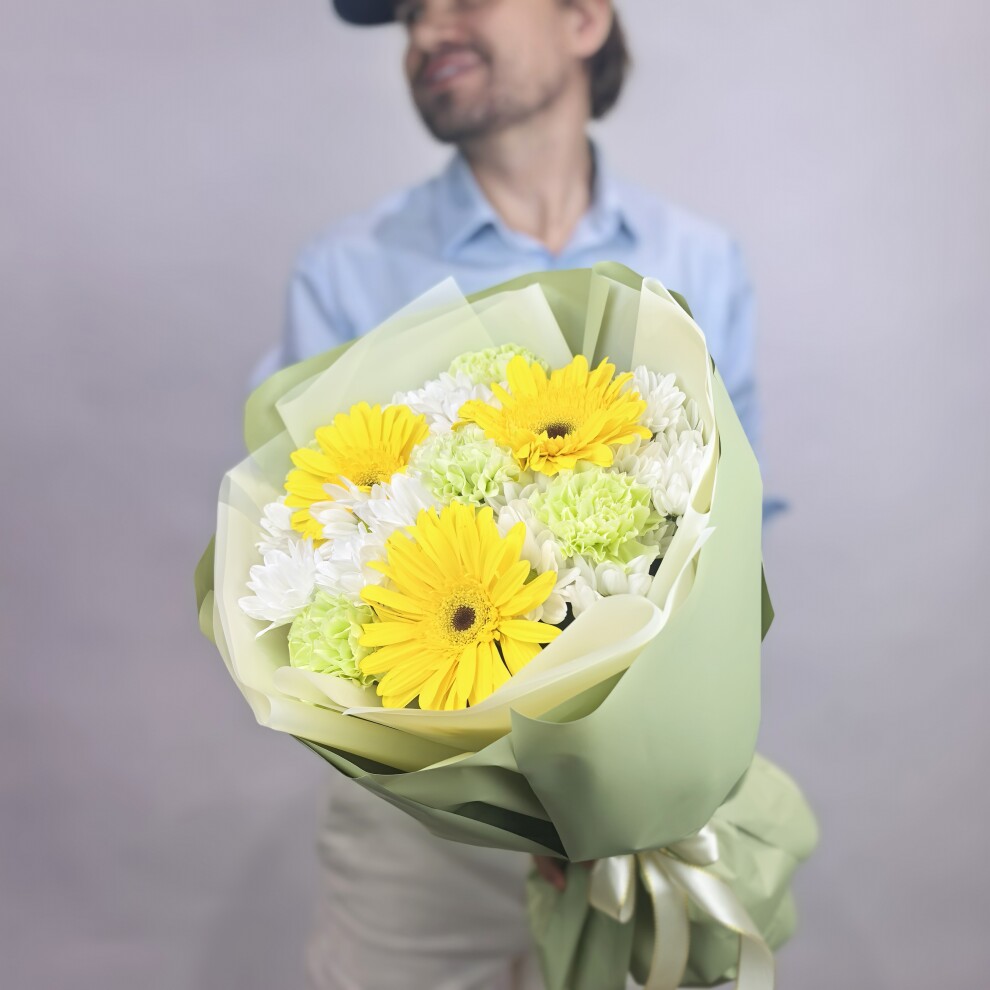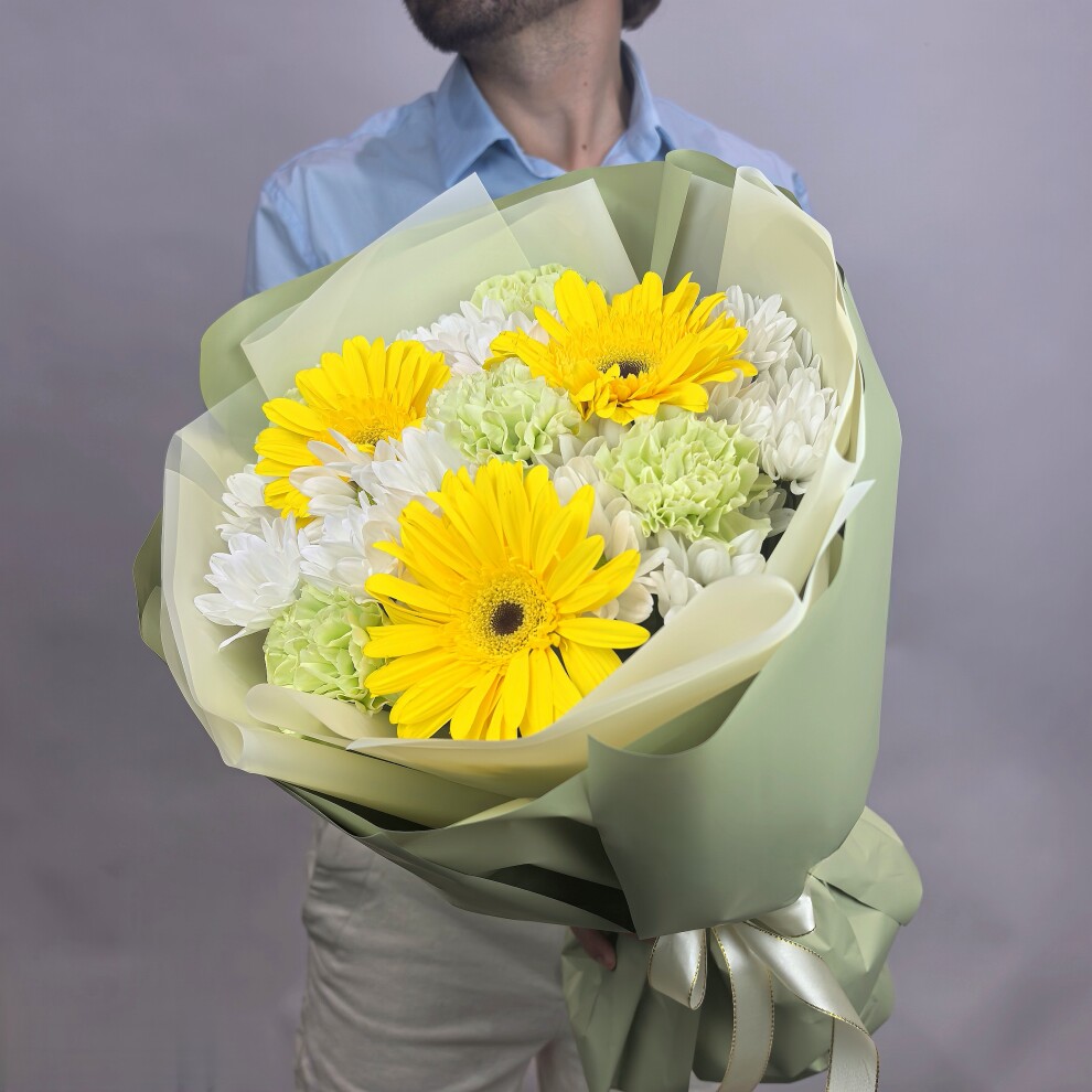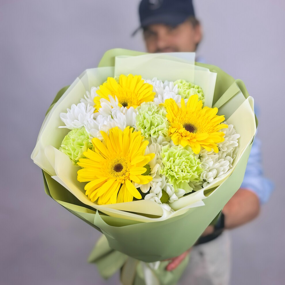 Этот букет — яркий и жизнерадостный ансамбль, наполненный светом и свежестью.