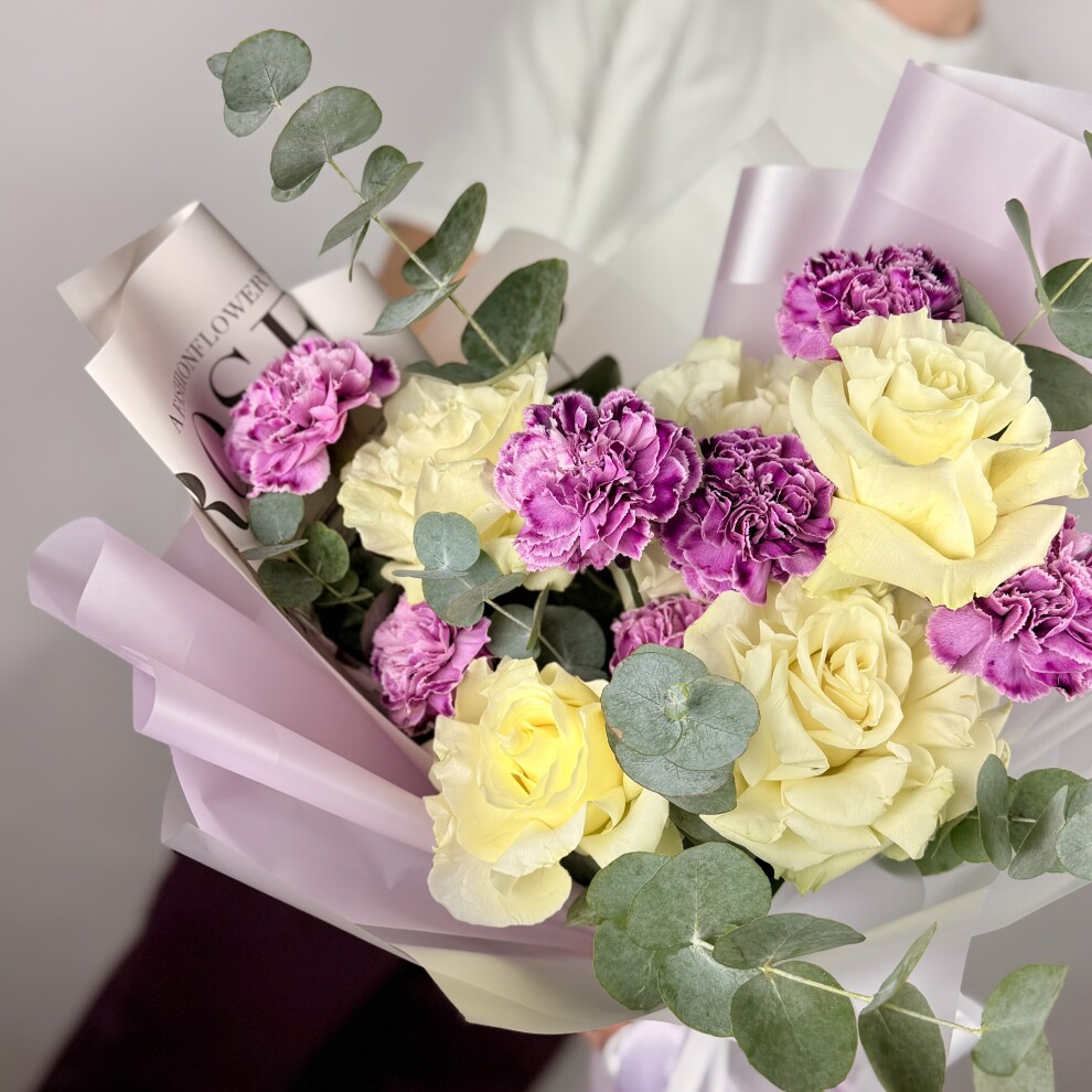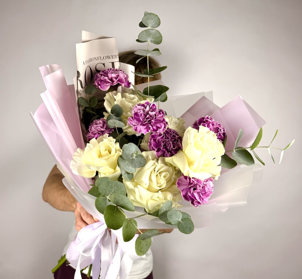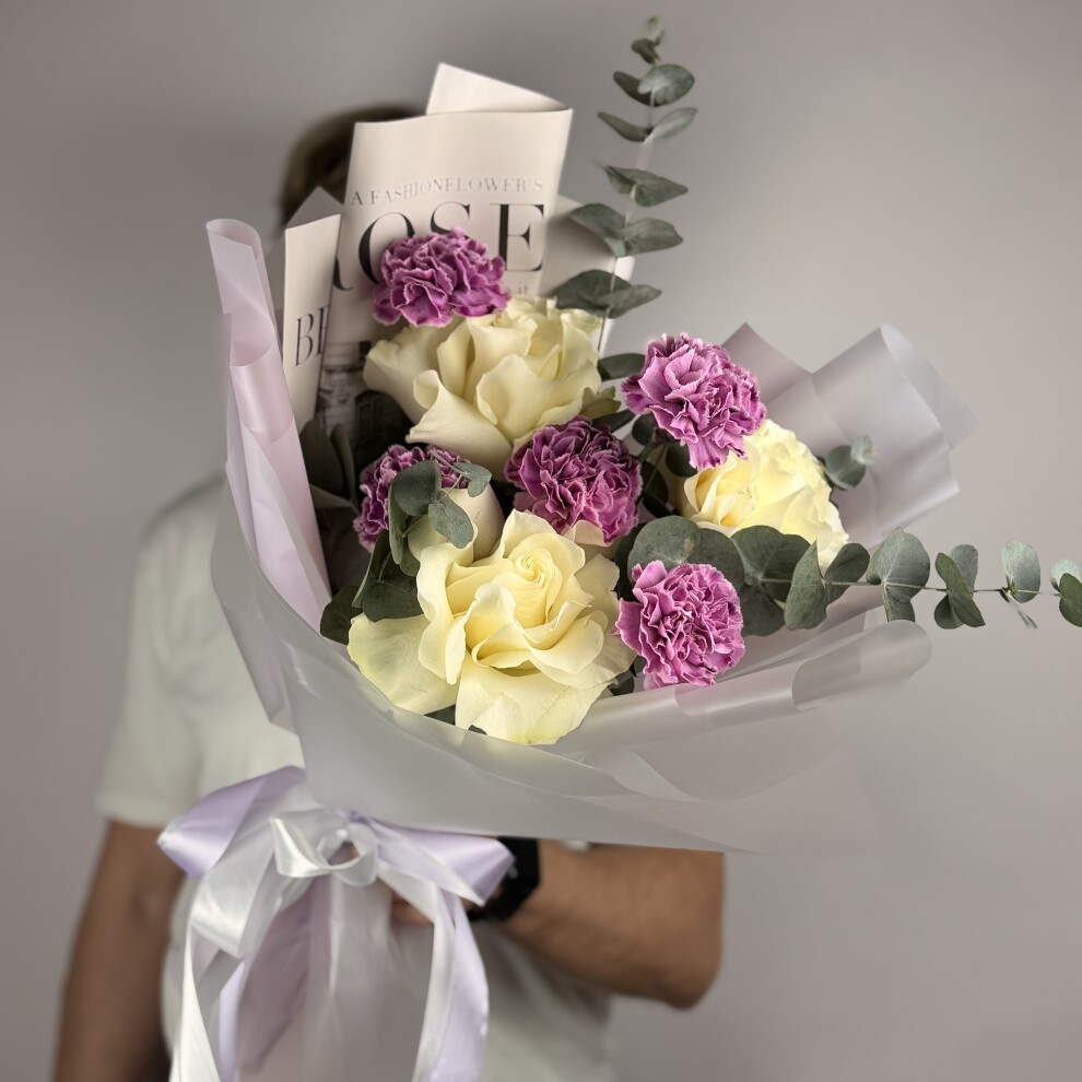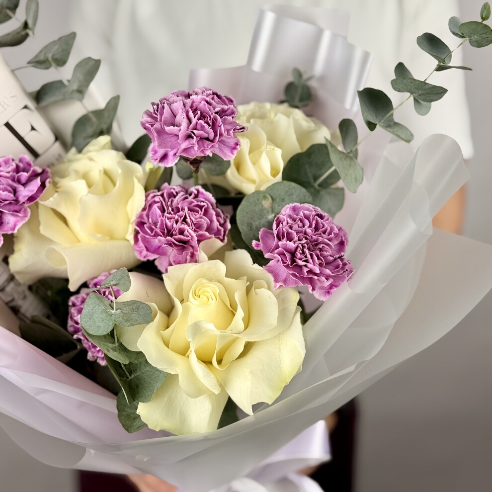 Этот изысканный букет — воплощение нежности и утончённости. Центром композиции стали кремовые розы, которые придают букету лёгкость и элегантность, напоминая о тёплом летнем рассвете. Их гармонично дополняют пышные гвоздики насыщенного розово-фиолетового оттенка, создающие выразительный контраст и добавляющие букету яркости.